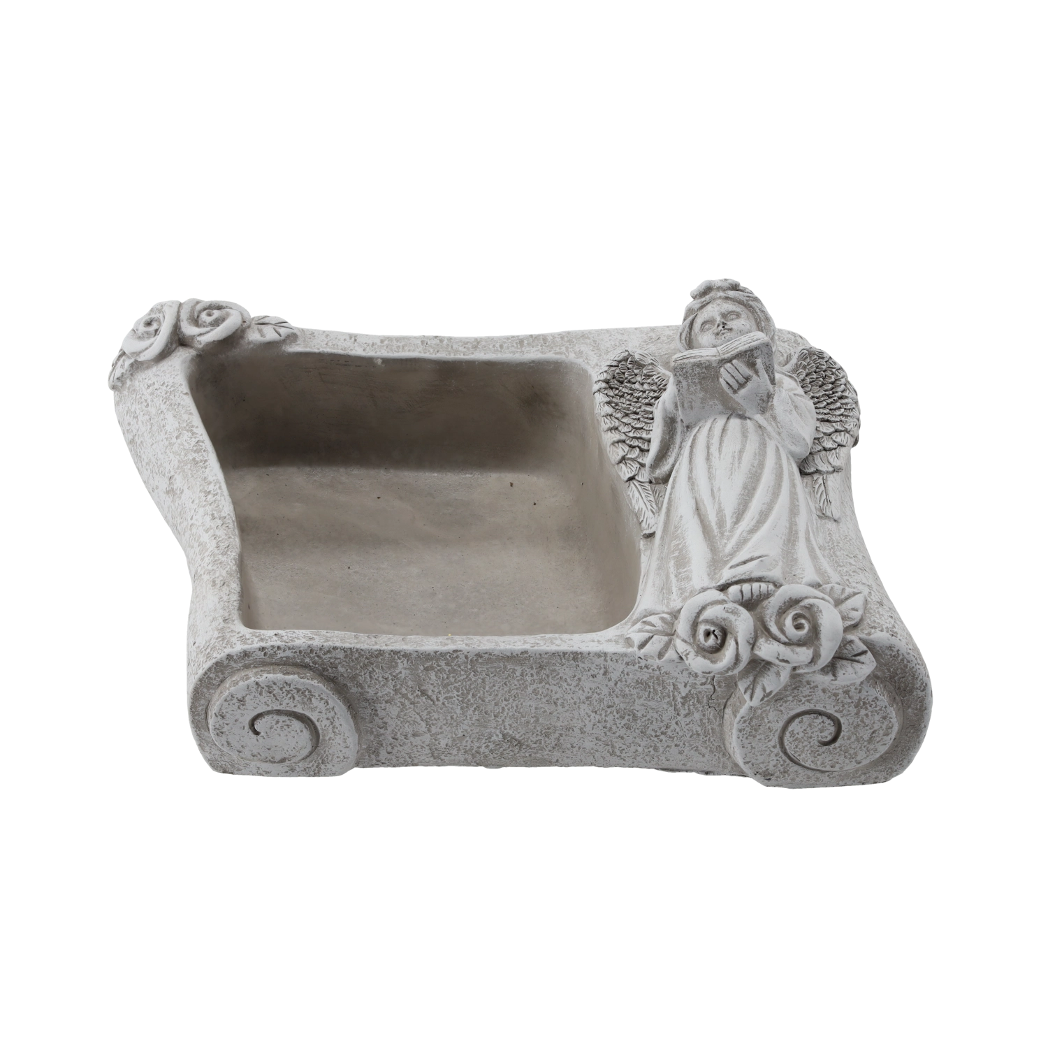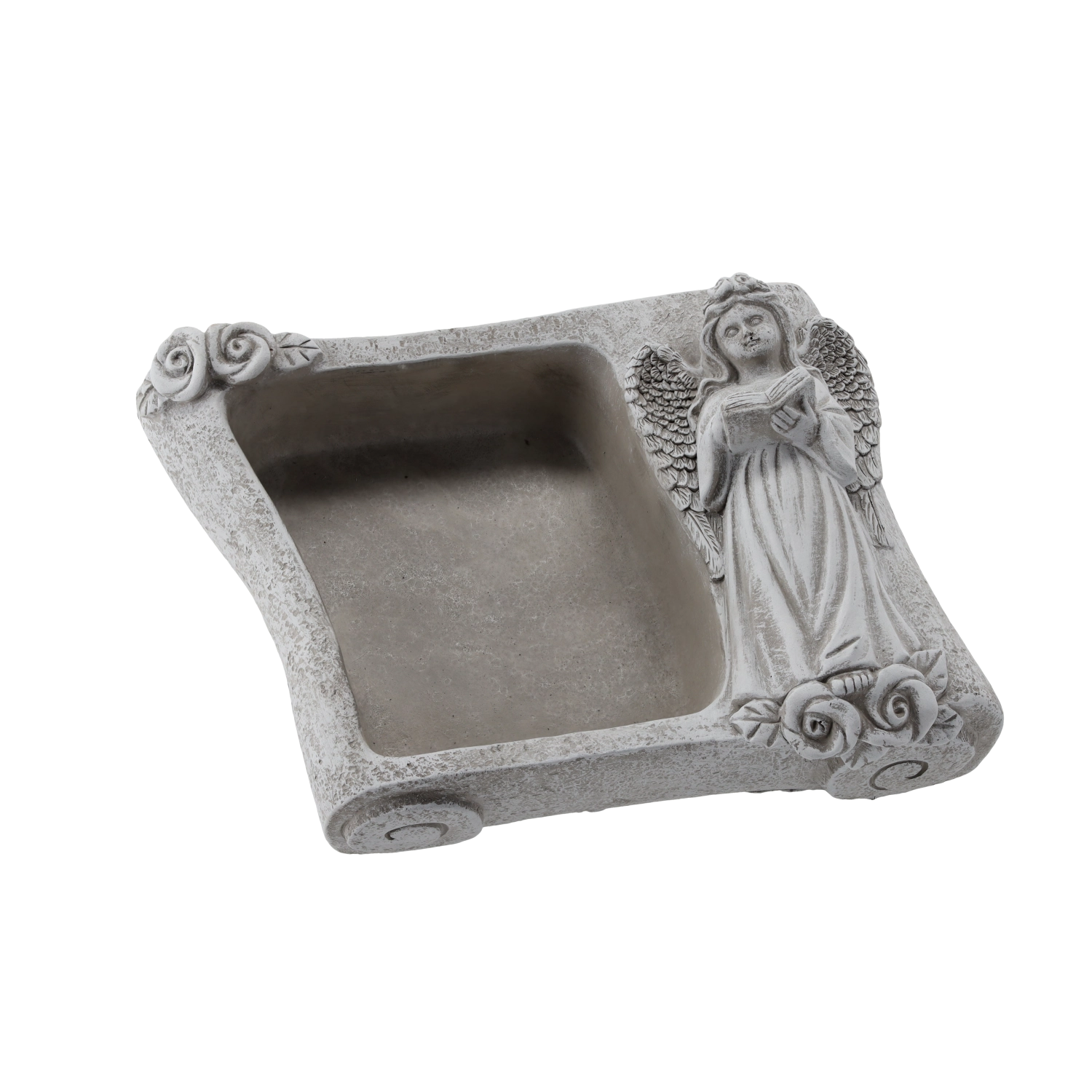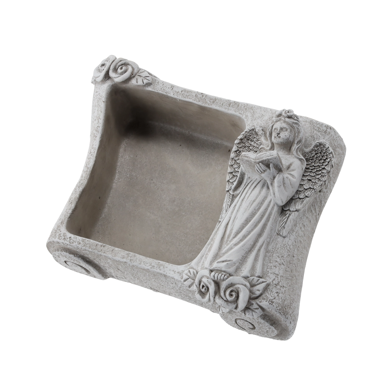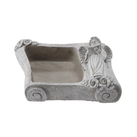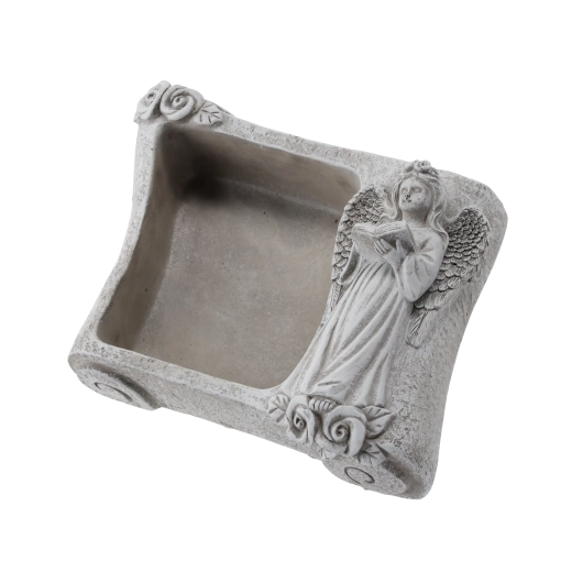 Táto dekoratívna kvetinová misa v tvare knihy zaujme prepracovanou figúrkou anjela s otvorenou knihou a reliéfnymi ružami v rohoch. Vďaka odolnému cementu a kamennej textúre je vhodná na vonkajšie aj interiérové použitie – na cintorínne dekorácie, do predsiene alebo ako štýlový doplnok obývacej izby.
