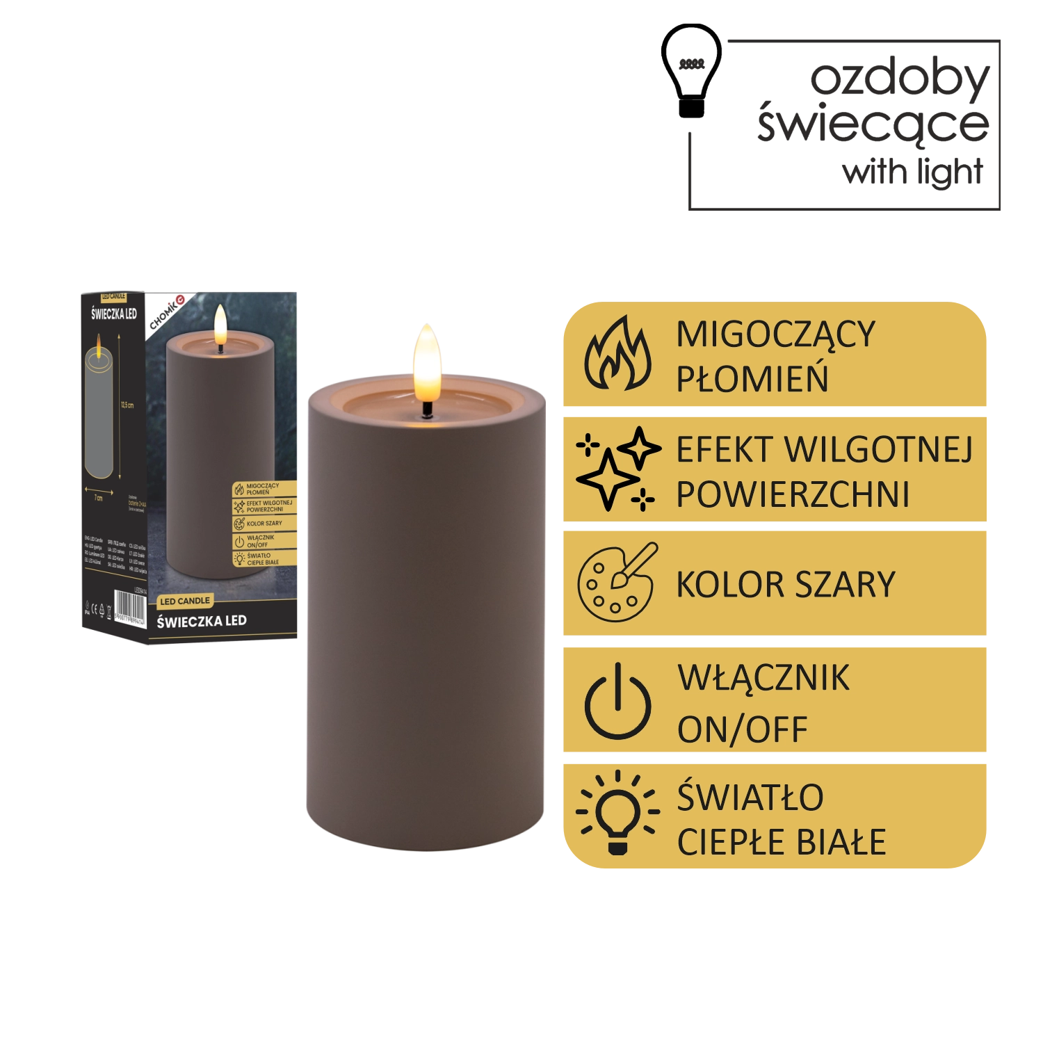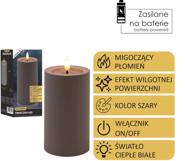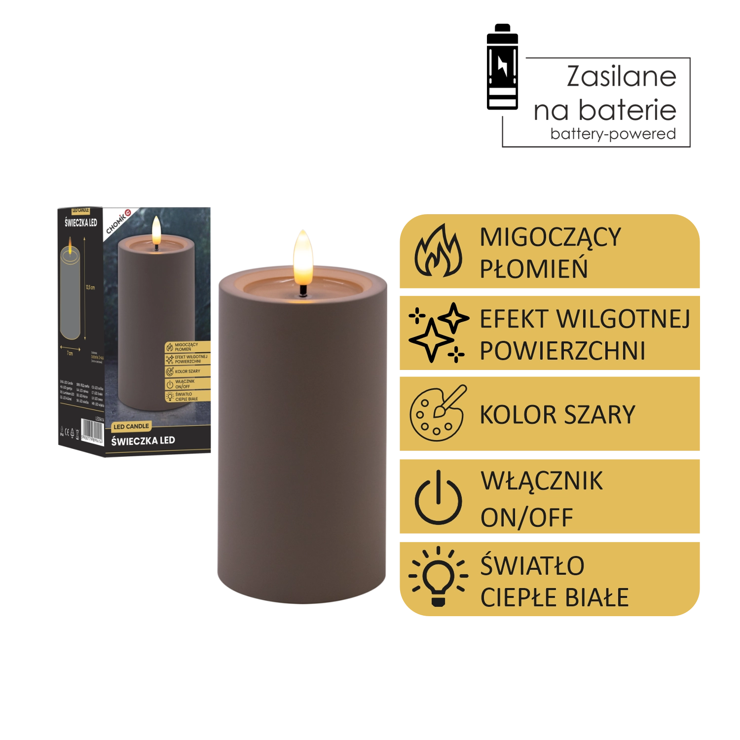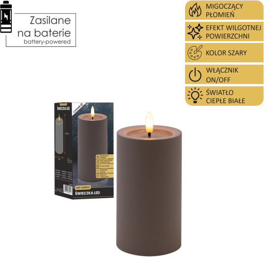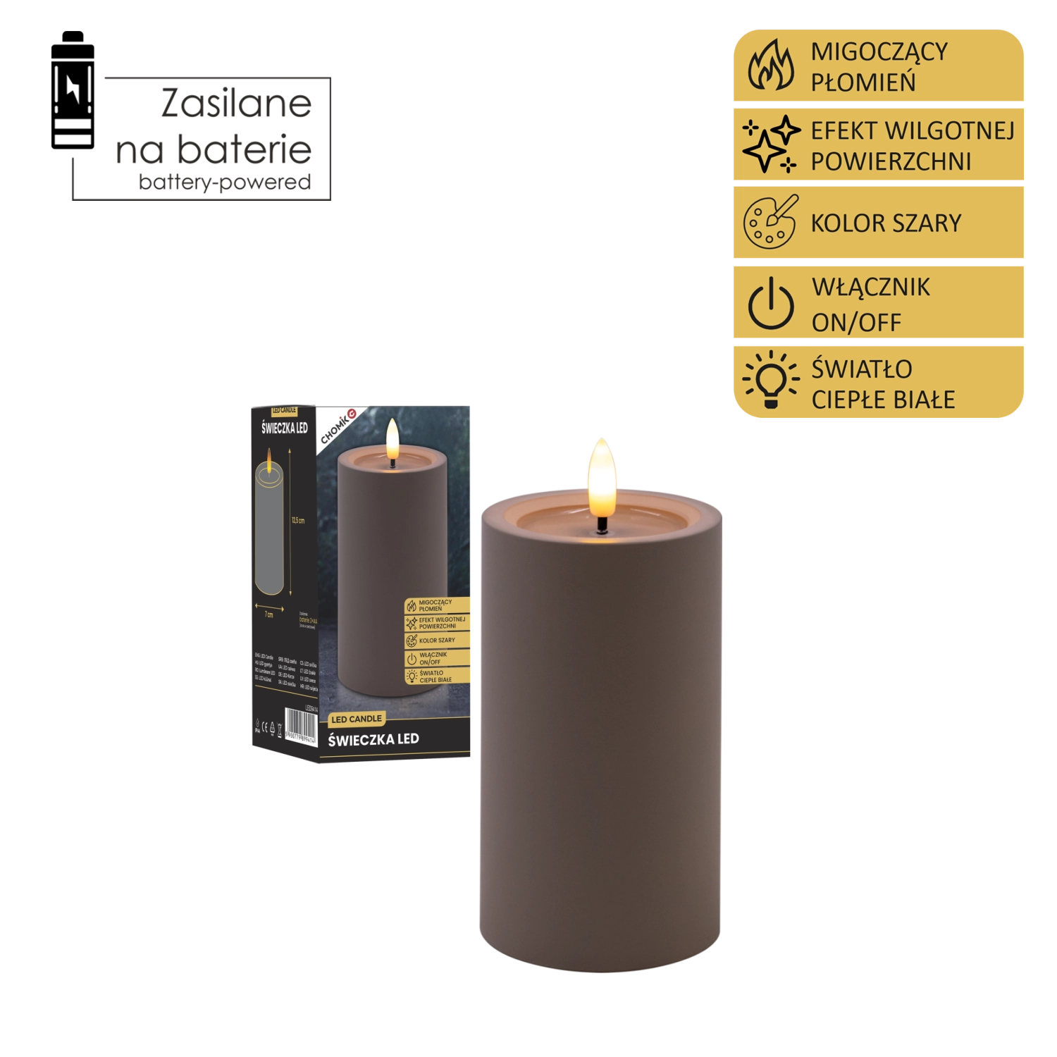 Elegantná sivá LED sviečka s realistickým, mihotavým plameňom v teple bielej farbe a efektom vlhkej hornej hrany pre prirodzený vzhľad. Skvele sa hodí do interiéru, bezpečná alternatíva ku klasickej sviečke, napájaná 2× AA batériami (nie sú súčasťou balenia).