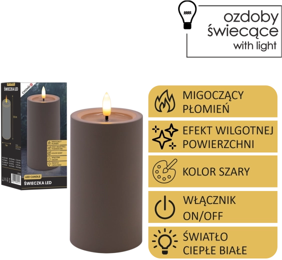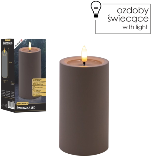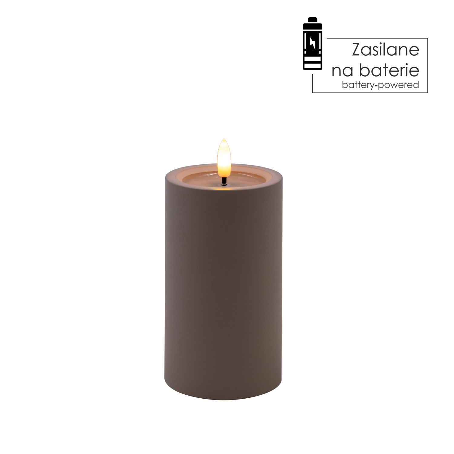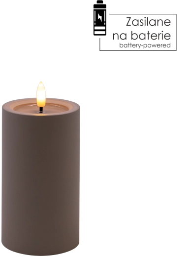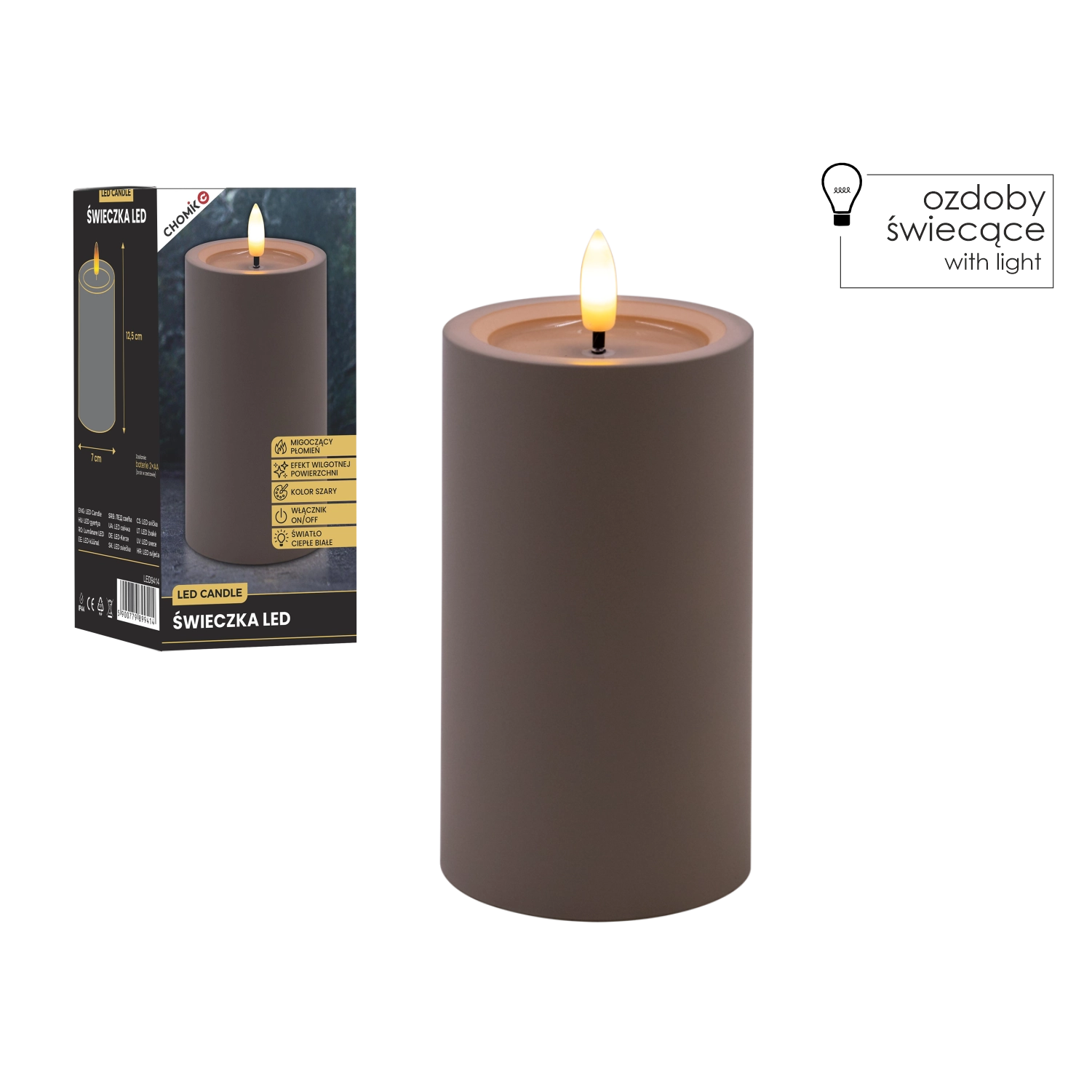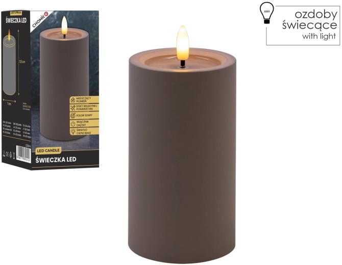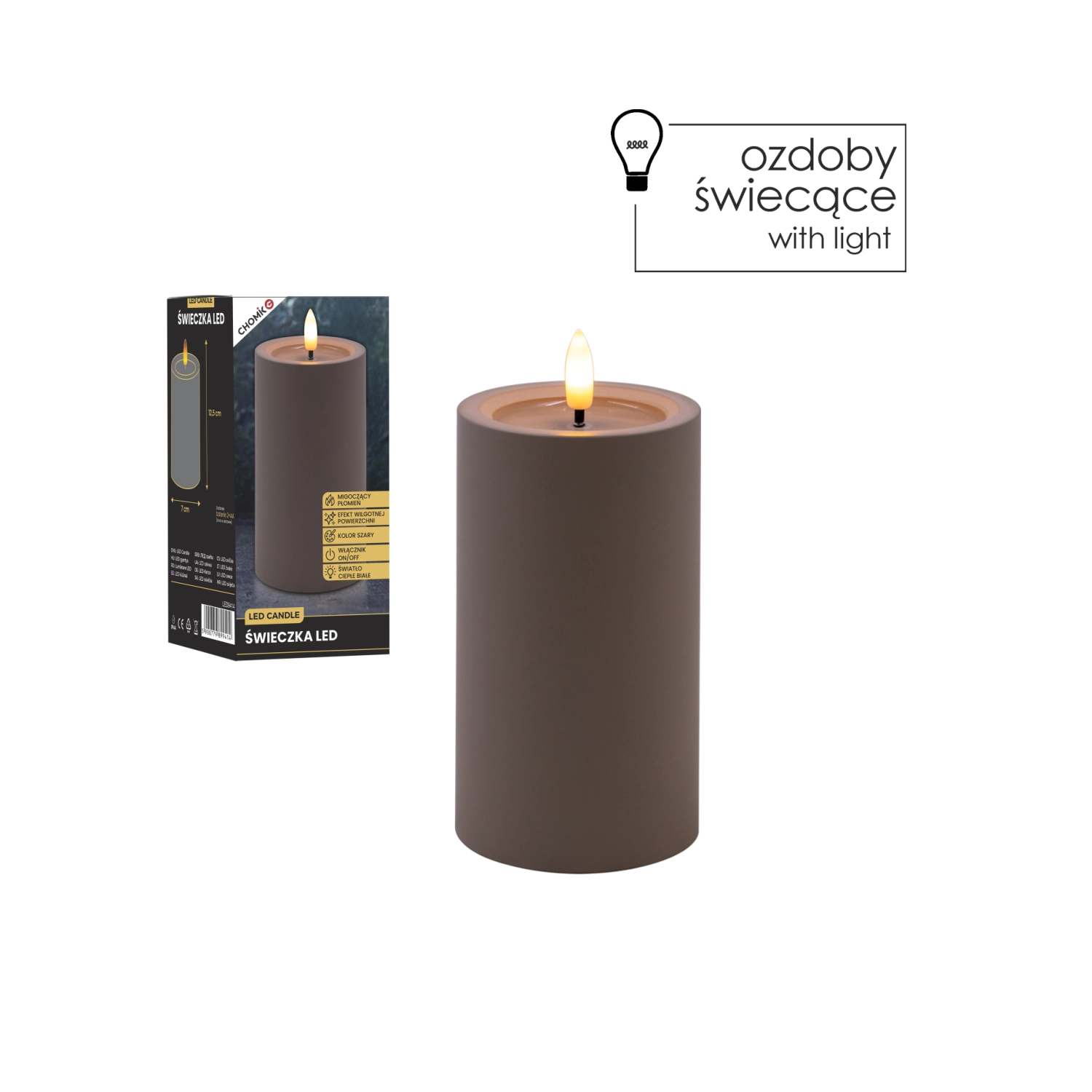 Elegantná sivá LED sviečka s realistickým, mihotavým plameňom v teple bielej farbe a efektom vlhkej hornej hrany pre prirodzený vzhľad. Skvele sa hodí do interiéru, bezpečná alternatíva ku klasickej sviečke, napájaná 2× AA batériami (nie sú súčasťou balenia).