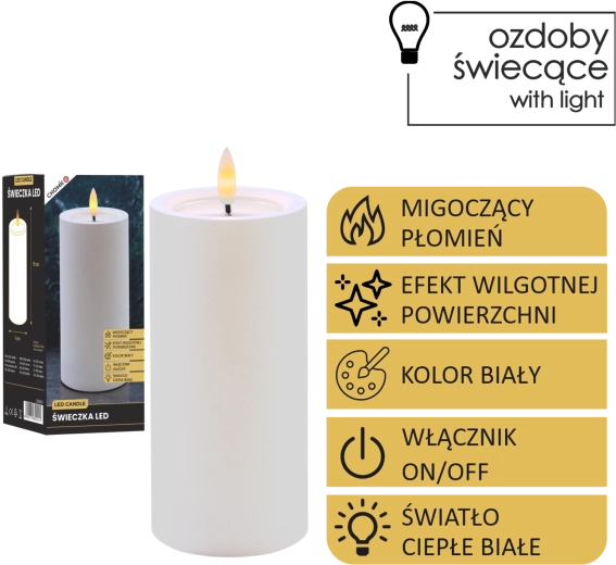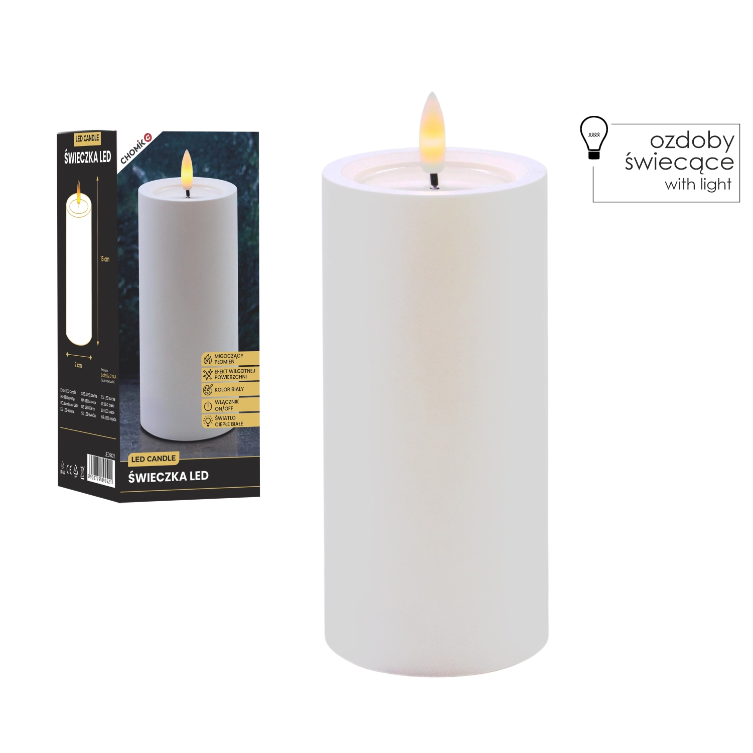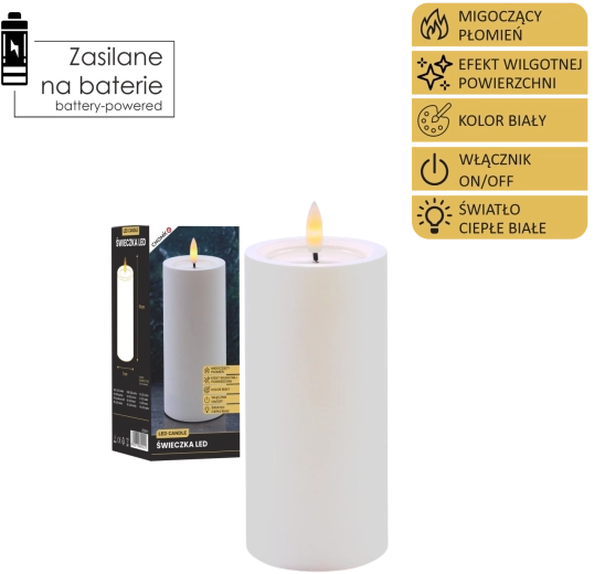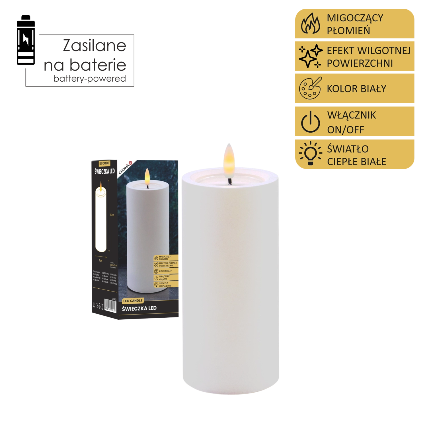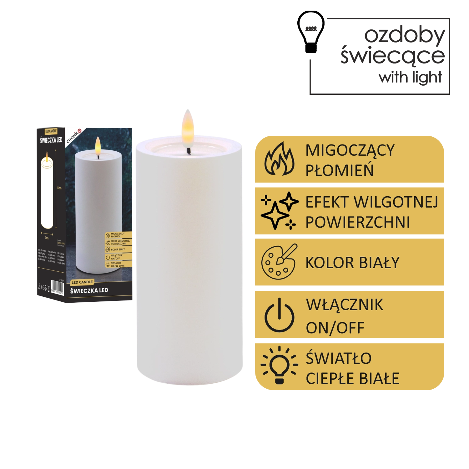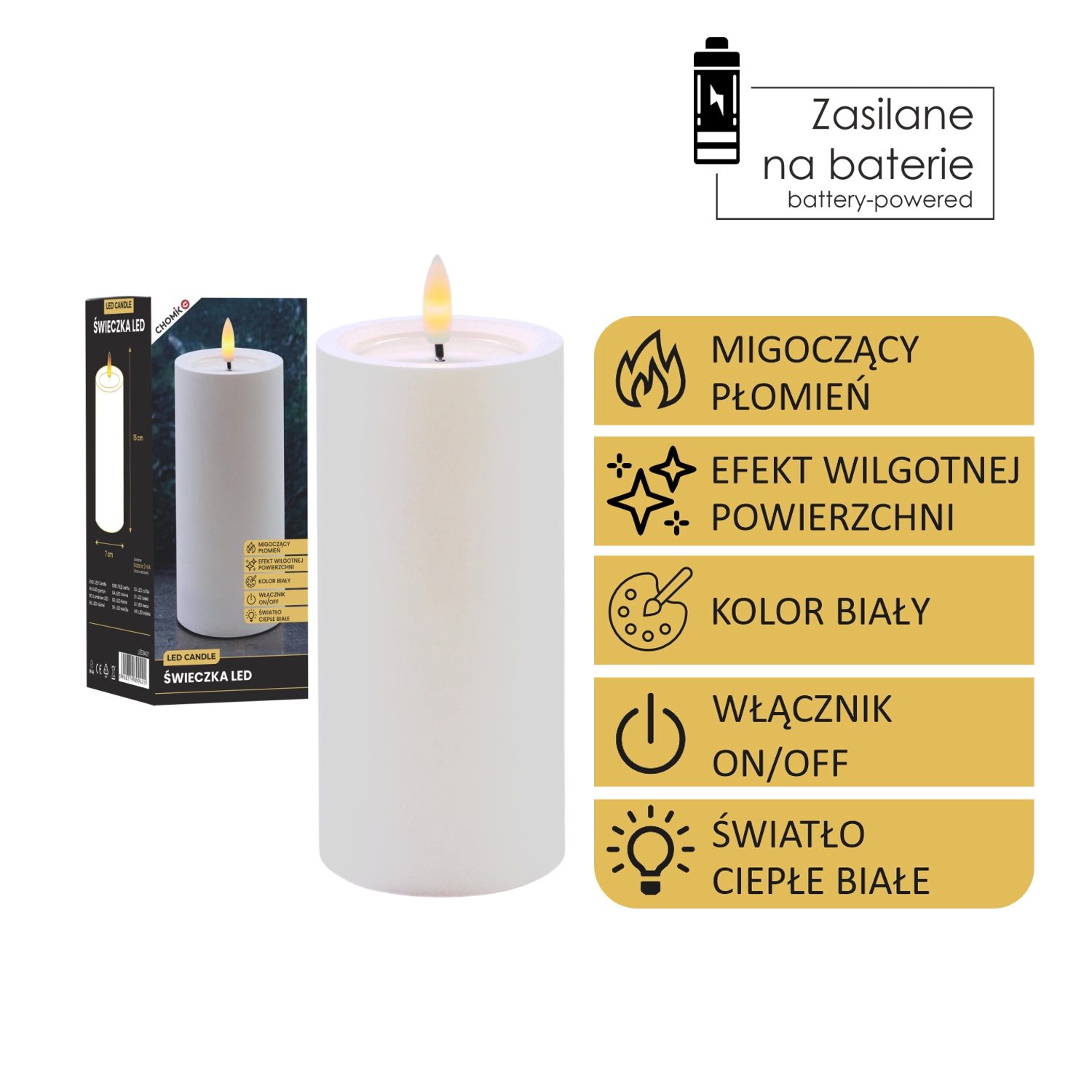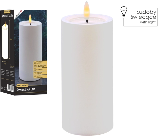 Elegantná LED sviečka v bielej farbe s rozmermi 7 × 15 cm prináša realistický blikajúci plameň v teplej bielej a pôsobivý efekt vlhkej hornej hrany. Skvele doplní interiérové dekorácie bez dymu a neporiadku.
