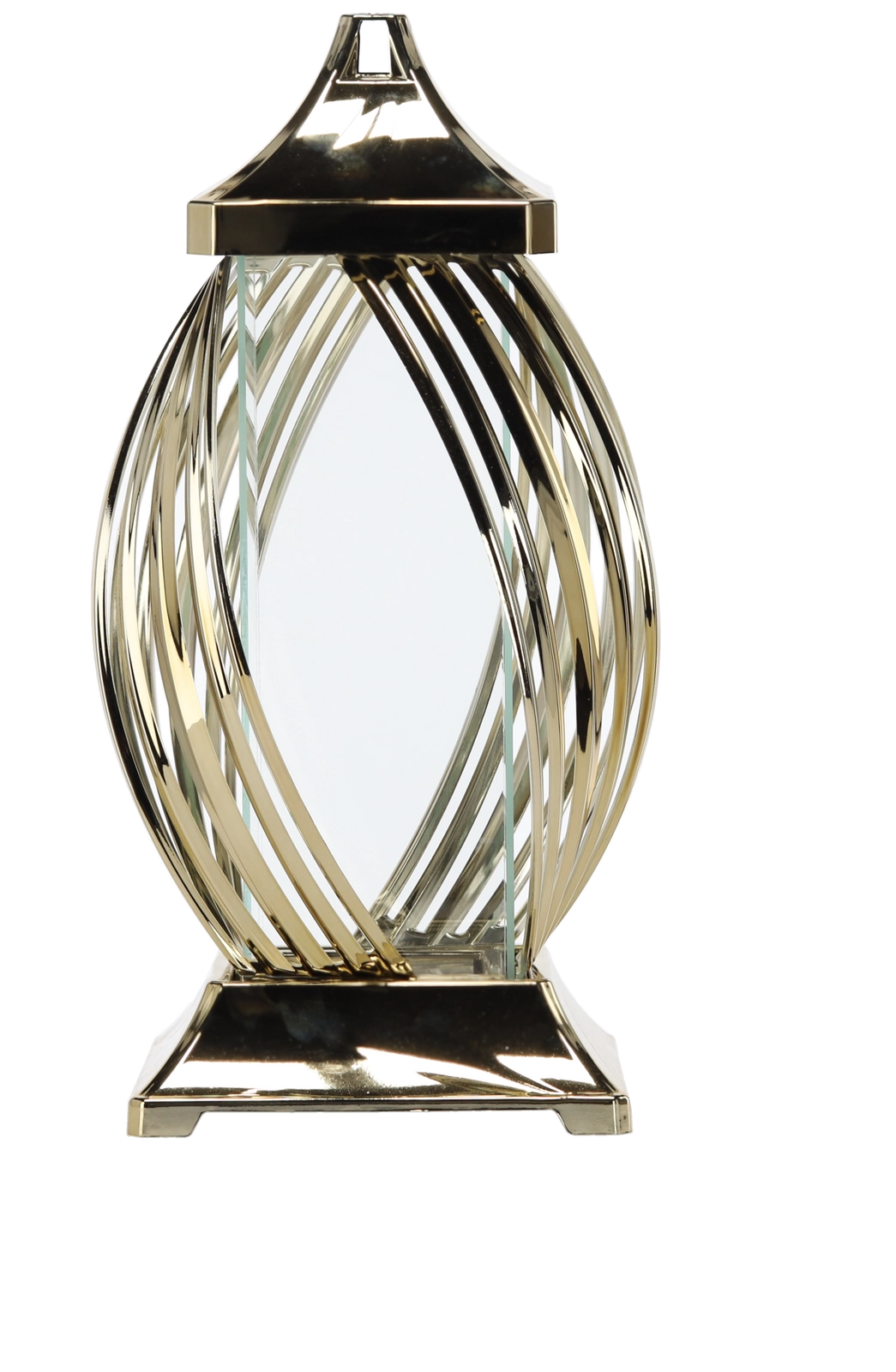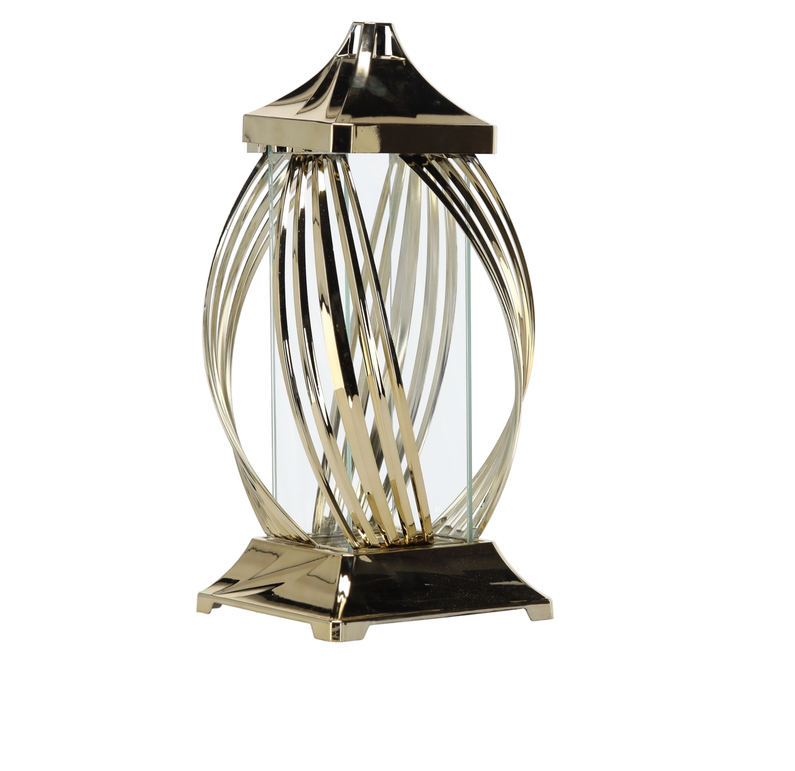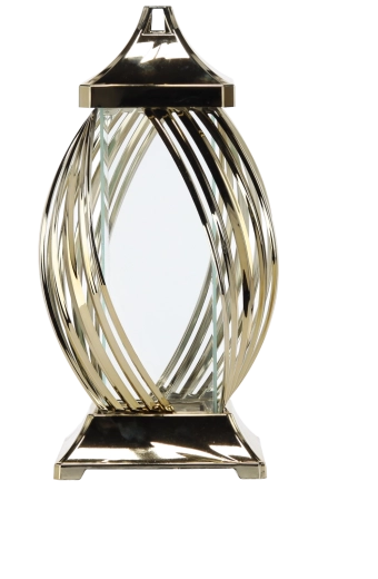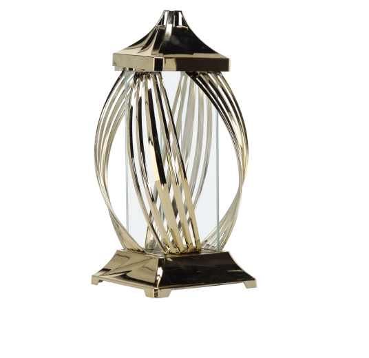 Tento dekoratívny kovový lampáš zaujme moderným motívom stuhy a lesklým metalickým povrchom. Priehľadné steny prepúšťajú svetlo sviečky alebo LED svetla a vytvárajú útulné a elegantné osvetlenie. Pevná konštrukcia so štvorcovou základňou zabezpečuje stabilitu, horný úchyt zase umožňuje jednoduché prenášanie alebo zavesenie.