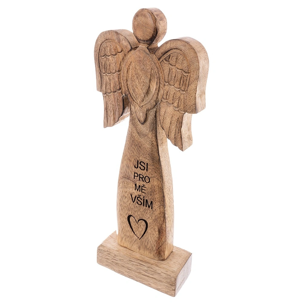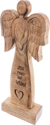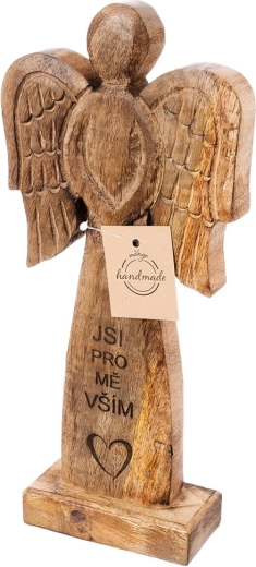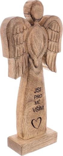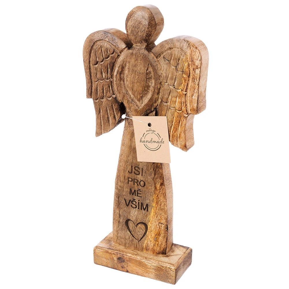 Táto pôsobivá figúrka anjela je vyrobená z prírodného dreva mangovníka a doplnená kovovými krídlami v čiernom prevedení. Vďaka neutrálnym farbám sa ľahko začlení do moderných aj rustikálnych interiérov a dodá im jemný, symbolický akcent.