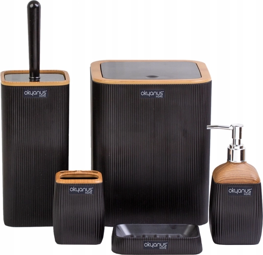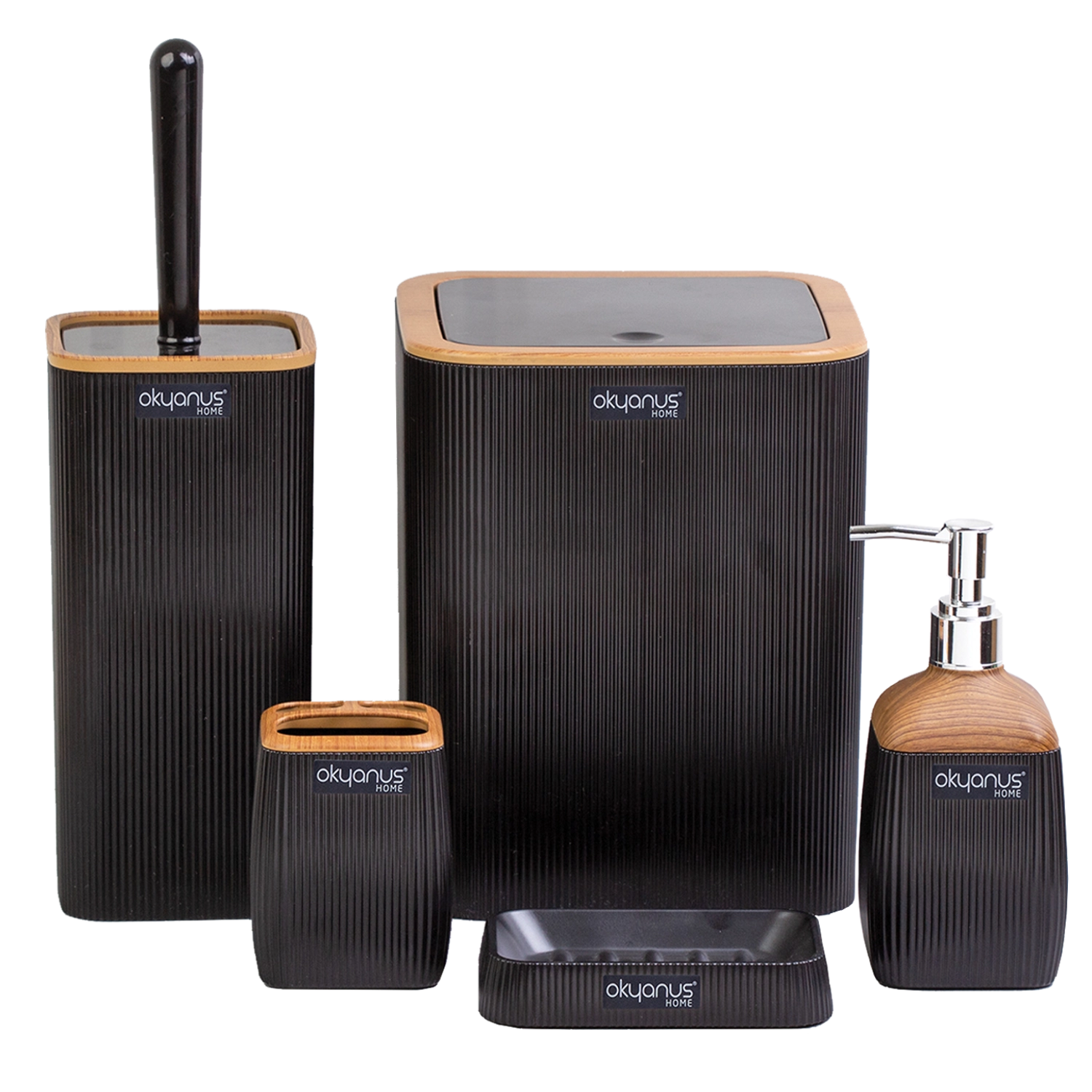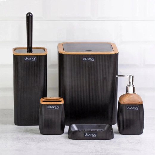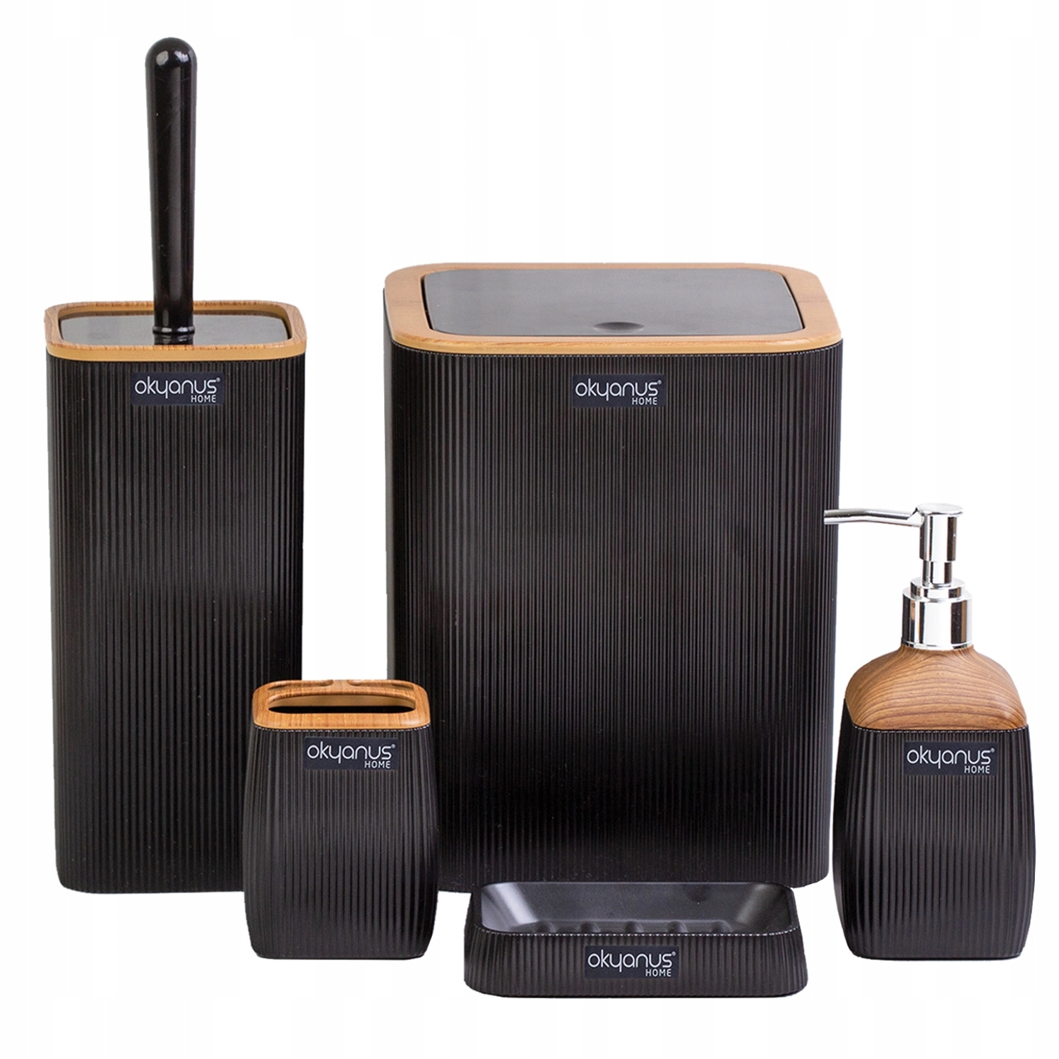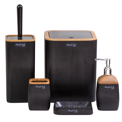 Štýlová štvorcová kúpeľňová sada v elegantnej čiernej farbe s dekorom dreva prinesie do vašej kúpeľne moderný vzhľad a praktickú organizáciu. Odpadkový kôš, WC kefa, dávkovač mydla, pohárik na kefky a mydelnička sú vyrobené z odolného plastu, ktorý sa ľahko čistí a výborne odoláva vlhkosti.