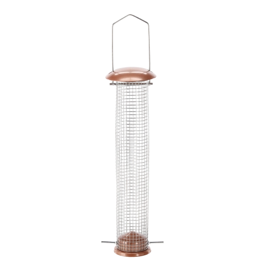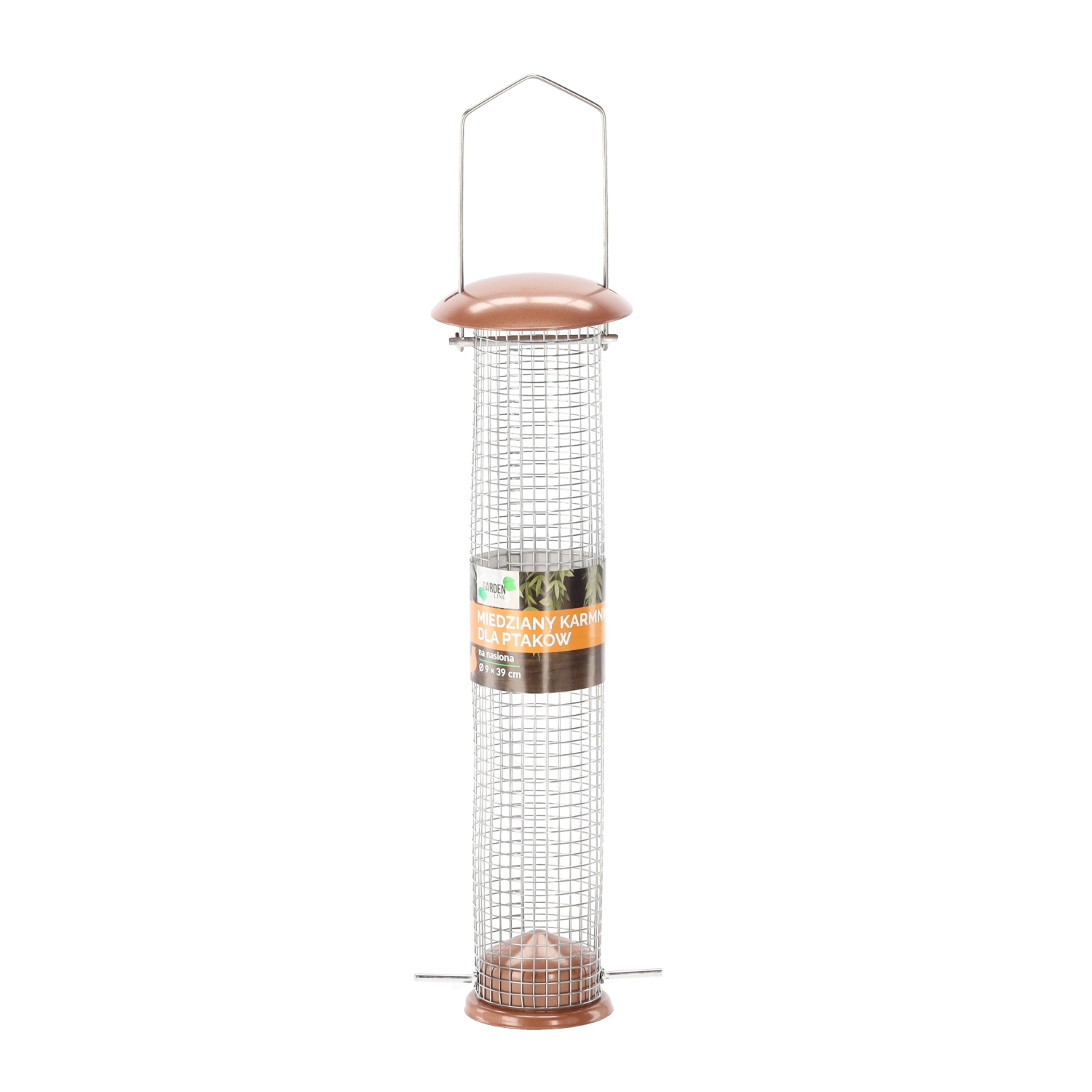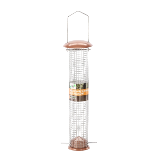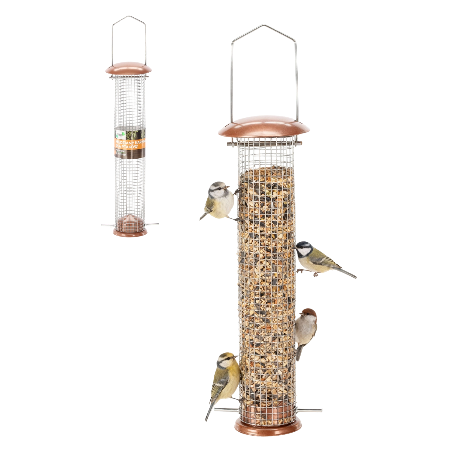 Štýlové a odolné krmítko pre vtáky v podobe tubusu z kovu a drôtenej siete v elegantnej medenej farbe. Ideálne na zavesenie v záhrade či na balkóne a pravidelné dopĺňanie semien. Vďaka praktickému závesu je inštalácia jednoduchá a rýchla, zatiaľ čo pevná kovová konštrukcia a efektné medené prevedenie zaisťujú dlhú životnosť aj atraktívny vzhľad.