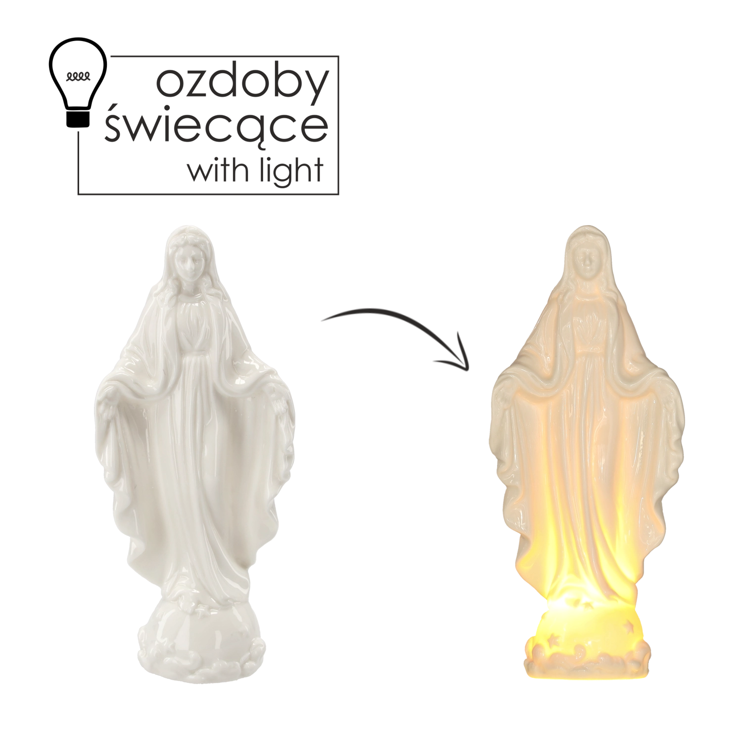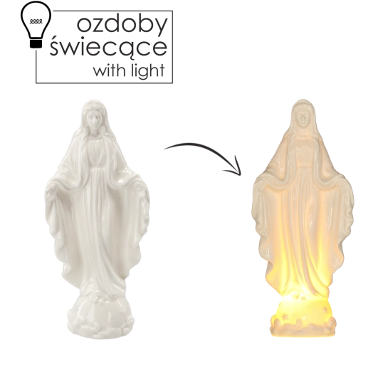 Táto vkusná dekorácia z porcelánu vyniká precíznym spracovaním a jemnými detailmi, ktoré umocňuje mäkké LED svetlo. Skvele sa hodí ako vyjadrenie viery a oddanosti, ale aj ako decentný bytový doplnok na vytvorenie ukľudňujúcej atmosféry.