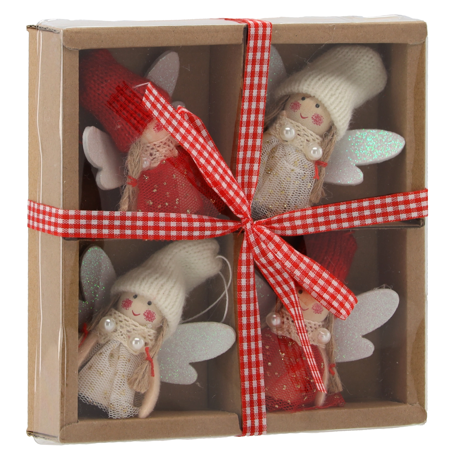 Sada štyroch anjelikov je uložená v kraftovej krabičke s okienkom a kockovanou stuhou – ideálna ako hotový vianočný darček.
