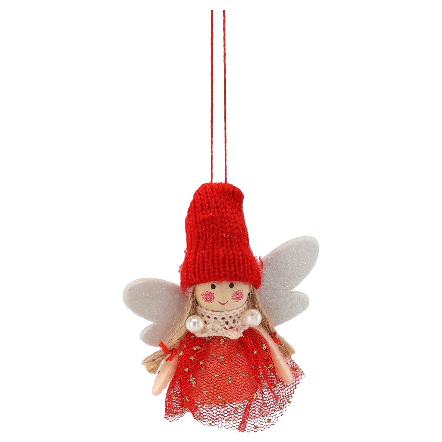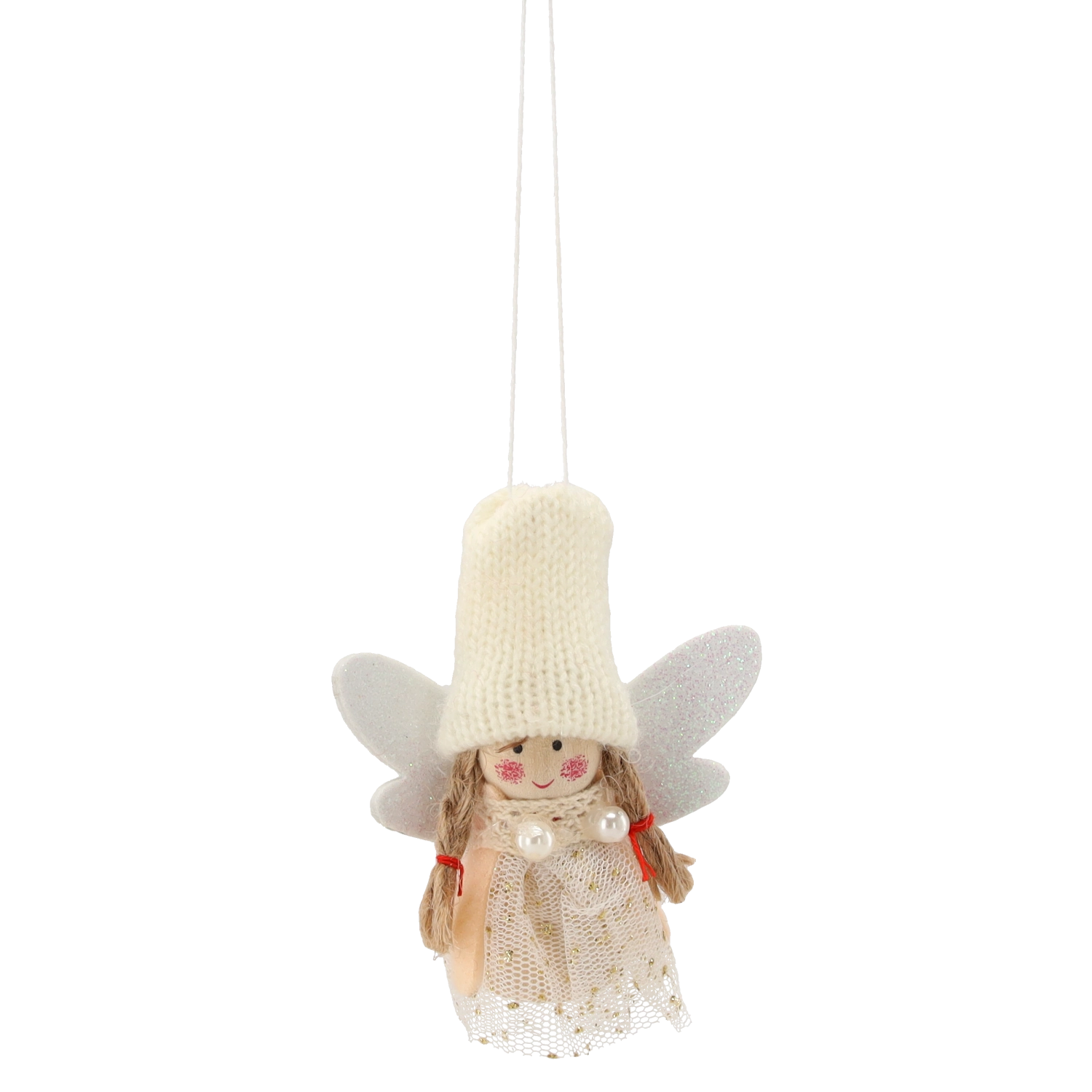 Ľahučká textilná ozdoba s trblietavými krídlami, tylovými šatami so zlatými bodkami a pútkom na jednoduché zavesenie dodá stromčeku teplý, sviatočný akcent.