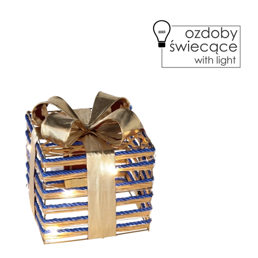 Elegantná vianočná dekorácia v tvare darčeka s veľkosťou 15 cm s teplým bielym LED osvetlením a veľkou modrou mašľou rozžiari váš domov. Ľahká konštrukcia z drôtu ovinutého zlatou šnúrkou vytvára romantickú atmosféru a vďaka batériovému napájaniu 3× AA ju jednoducho umiestnite kamkoľvek – na parapet, pod stromček, vedľa krbu alebo ako vonkajšiu ozdobu pri vchode.