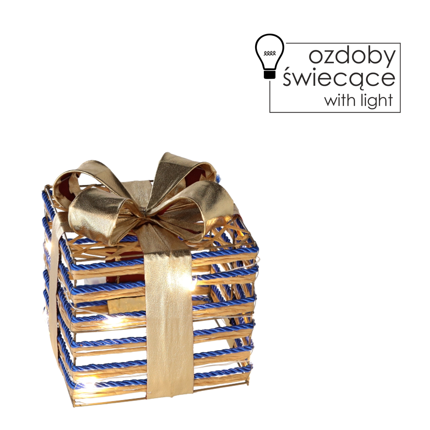 Tento svietiaci vianočný darček je štýlovým doplnkom, ktorý okamžite navodí sviatočnú náladu. Kombinácia zlatého lesku a sýtej modrej mašle pôsobí luxusne a zároveň jemne. Teplé biele LED diódy šetria energiu, pritom krásne presvietia štruktúru šnúrky a vytvoria útulnú zimnú atmosféru.