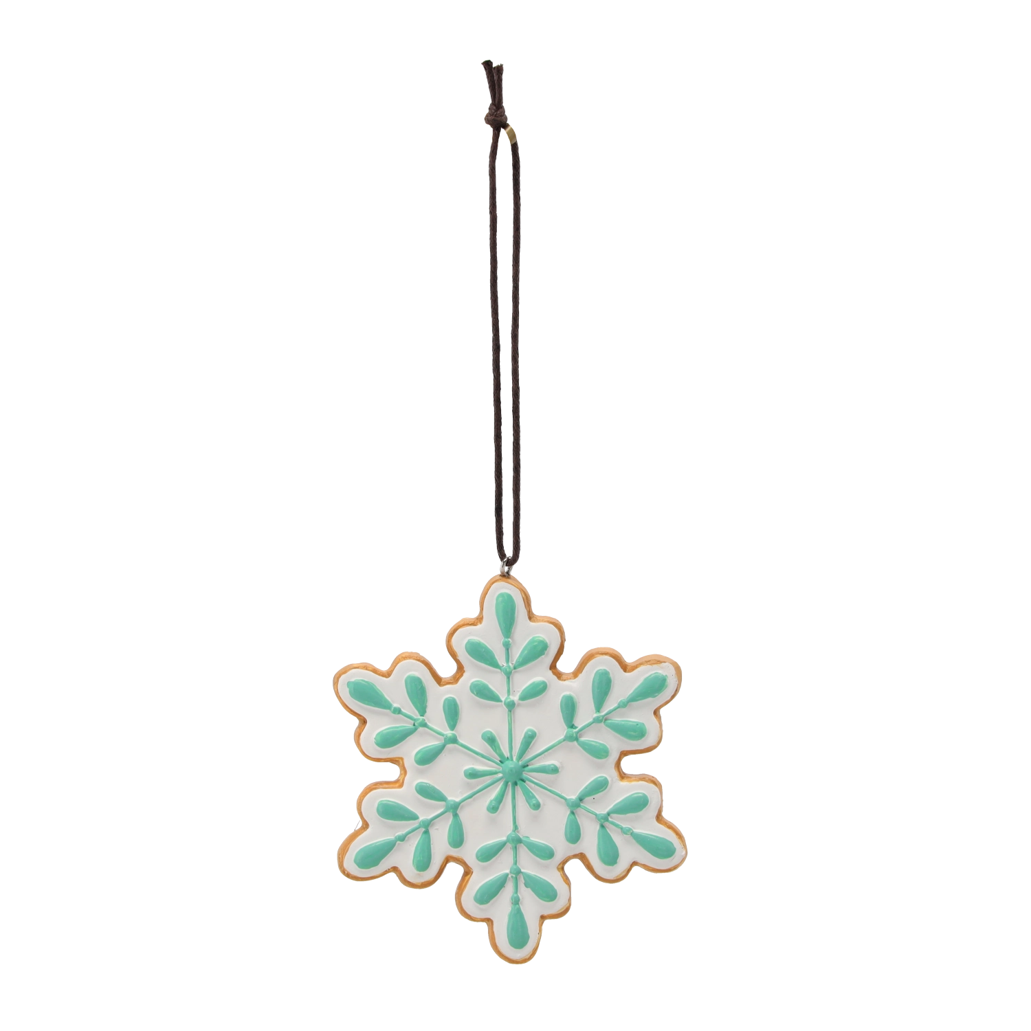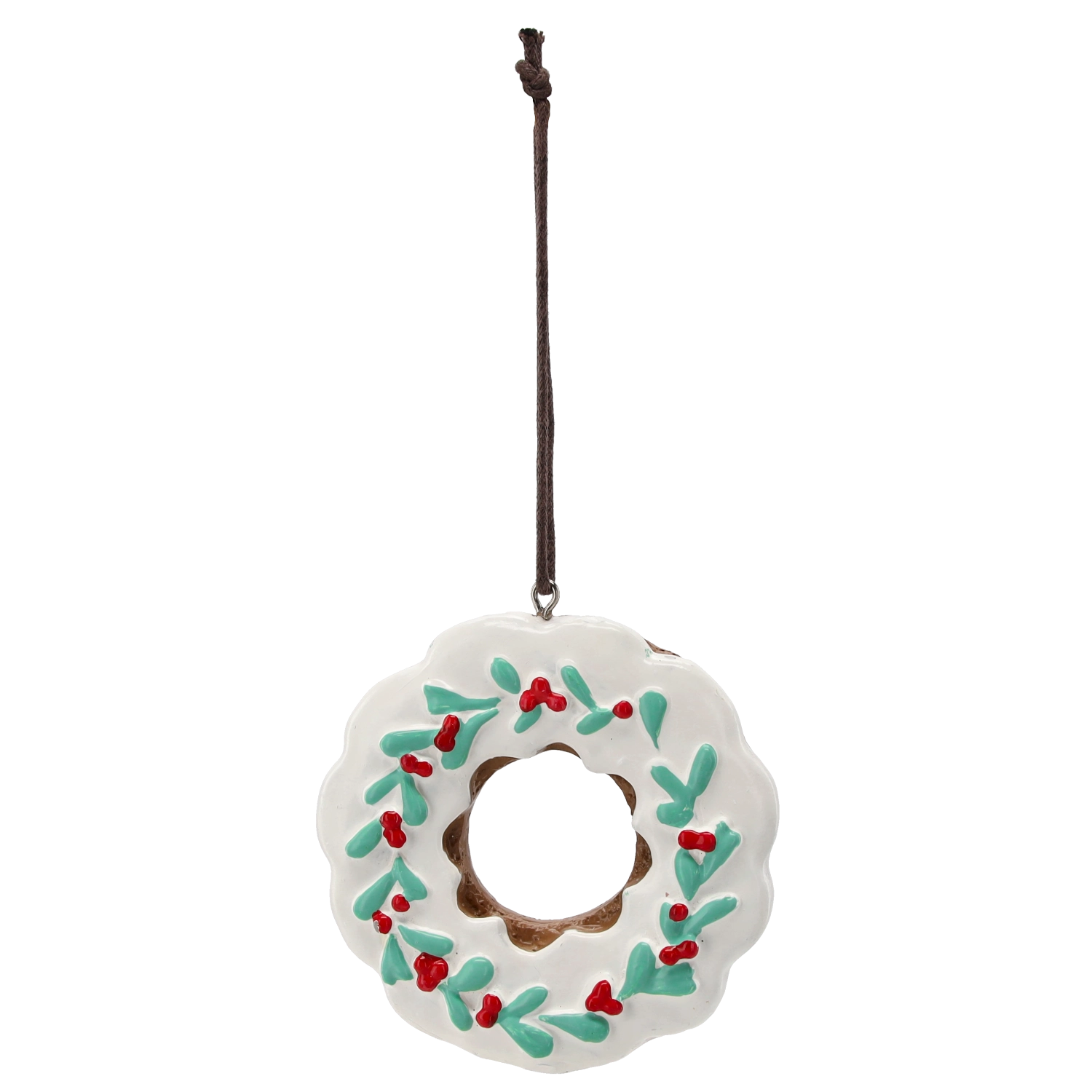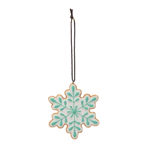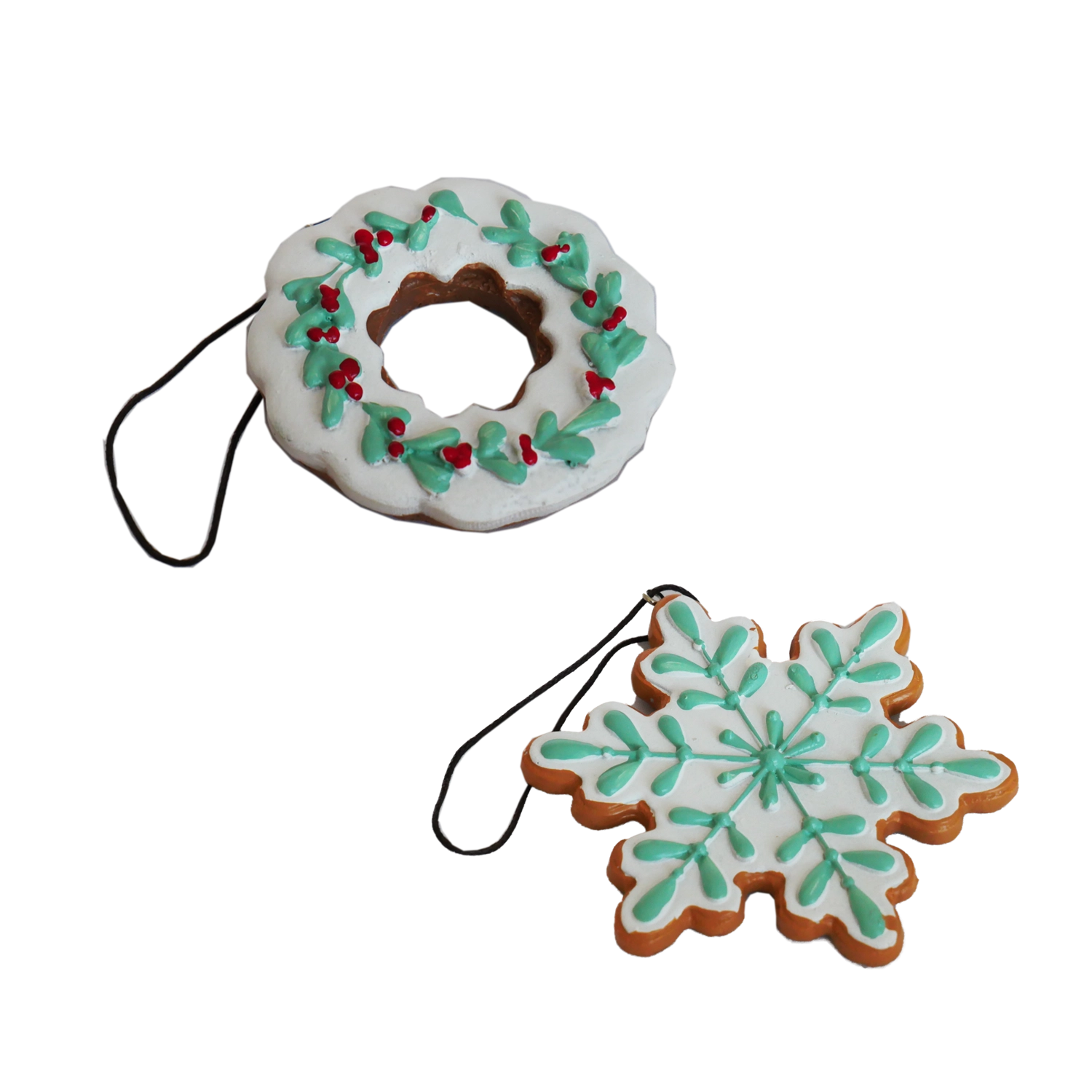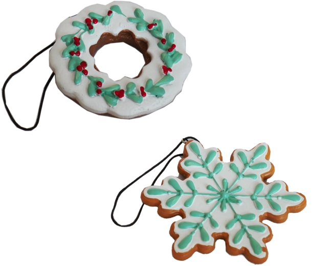 Elegantné vianočné ozdoby inšpirované vzhľadom perníkov dodajú výzdobe jemný, ručne vyrábaný nádych. Závesné motívy snehovej vločky a venca v bielej glazúre s akcentmi zelených lístkov a červených bobúľ krásne vyniknú na prírodnom aj farebnom ihličí. Vďaka tmavej stužke ich ľahko zavesíte na vetvy, vence aj háčiky.