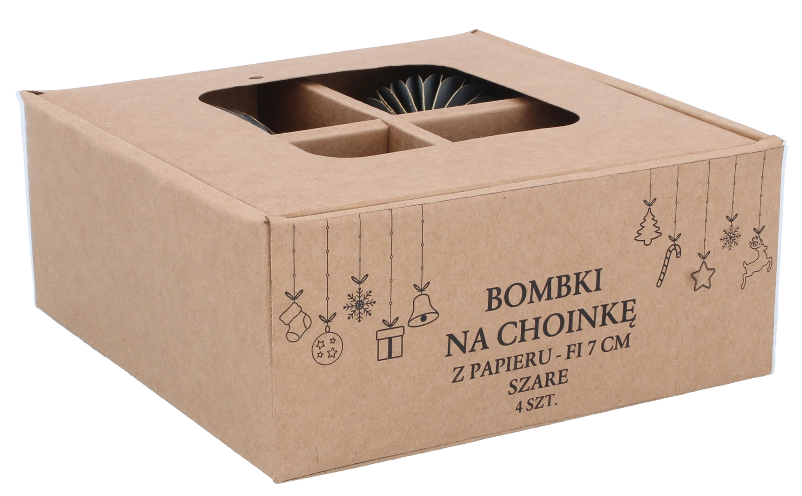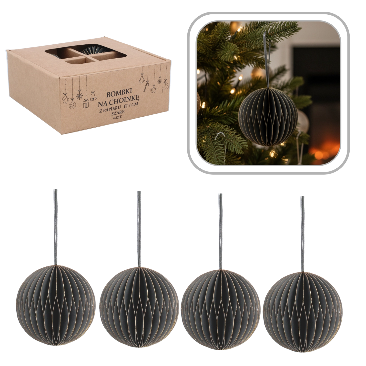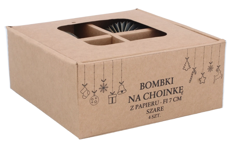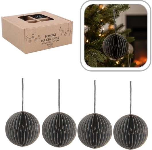 Elegantná sada štyroch papierových vianočných ozdôb s priemerom 7 cm v sivej farbe prináša moderný, harmonický a bezpečný doplnok vašej sviatočnej výzdoby. Sú ľahké, netrieštivé a odolné, so šnúrkami na jednoduché zavesenie na stromček, vence aj girlandy. Minimalistický dizajn sa skvele kombinuje s ďalšími dekoráciami a dodá interiéru elegantne vyvážený vzhľad.