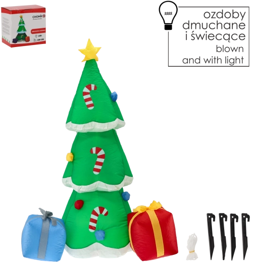 Dodajte svojim Vianociam pútavú dominantnú dekoráciu. Farebný nafukovací stromček s hviezdou a darčekmi okolo upúta pozornosť detí aj dospelých, a to vnútri aj vonku. Stačí zapojiť do zásuvky – zabudovaný motor sa postará o automatické nafúknutie a LED osvetlenie vytvorí útulnú atmosféru po celý večer.