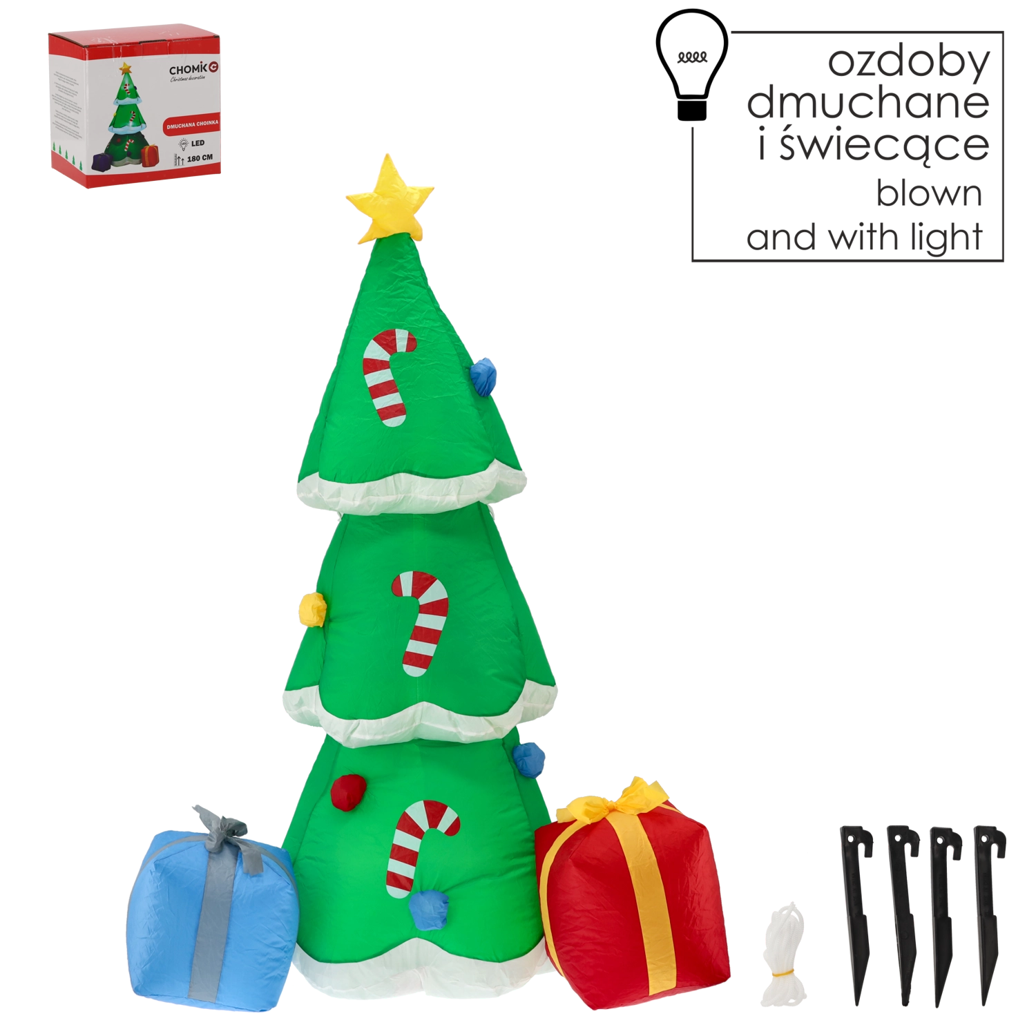 Nafukovací vianočný stromček s LED osvetlením s výškou 180 cm premení záhradu aj interiér na čarovnú sviatočnú scénu. Vďaka integrovanému ventilátoru sa sám nafúkne počas pár minút, odolné prevedenie IP44 zvládne vonkajšie podmienky a biele LED diódy zaistia krásny efekt po zotmení. Jednoduchá inštalácia a bezpečné nízkonapäťové napájanie s certifikáciami CE, ROHS, EMC a LVD.