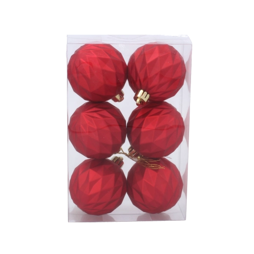 Dodajte svojmu stromčeku moderný šmrnc so súpravou šiestich vianočných gulí s priemerom 6 cm. Ľahký, netrieštivý plast a matný geometrický dizajn zaručujú elegantný vzhľad, ľahké zavesenie a dlhú životnosť. Štýlová kombinácia červenej, zlatej a striebornej farby sa skvele hodí k väčšine sviatočných dekorácií.
