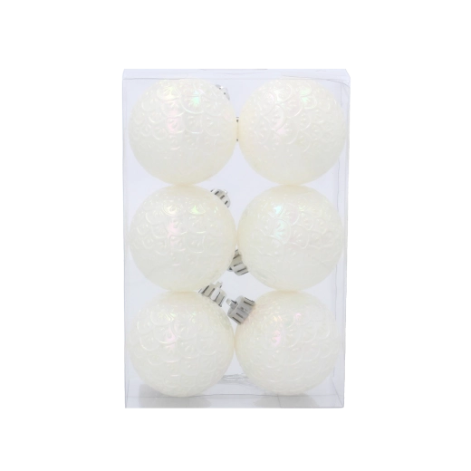 Elegantná sada bielych vianočných gulí s priemerom 6 cm dodá stromčeku čistý a štýlový vzhľad. Ľahký a nerozbitný plast je bezpečný pre deti aj domácich miláčikov a vďaka praktickým pútkam je zavesenie rýchle a jednoduché. Skvele sa kombinuje s červenou, zlatou aj striebornou výzdobou.
