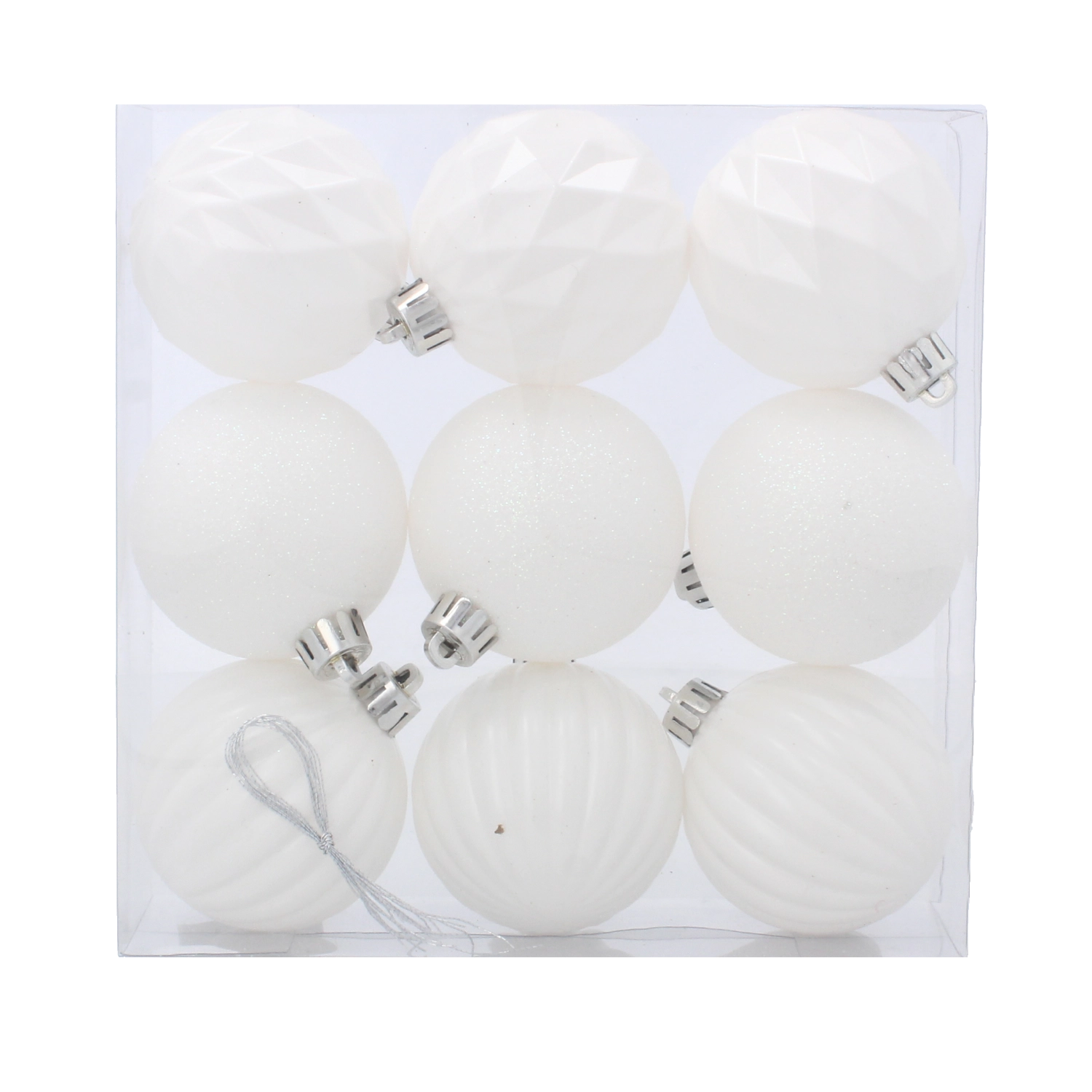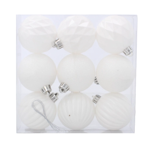 Doprajte svojej vianočnej výzdobe čistý a nadčasový vzhľad. Táto sada 9 bielych ozdôb kombinuje rôzne povrchové úpravy – mat, lesk a trbliet – vďaka čomu stromček pôsobí bohato a vyvážene. Neutrálna biela farba skvele ladí s prírodnými aj farebnými dekoráciami.