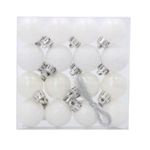 Doprajte svojmu stromčeku nadčasový šarm so sadou 16 bielych vianočných ozdôb s priemerom 3 cm. Kombinácia matných, lesklých, trblietavých aj disco efektov vytvára harmonický celok a elegantný vzhľad. Ozdoby sú nerozbitné, vyrobené z odolného plastu a vybavené šnúrkami na jednoduché zavesenie, takže sú ideálne do domácností s deťmi aj domácimi miláčikmi.