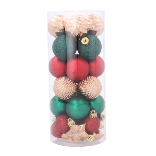 Každá guľa má zlatú alebo striebornú šnúrku na rýchle zavesenie. Tradičná červená, zlatá a zelená sa ľahko kombinuje s ďalšími dekoráciami.