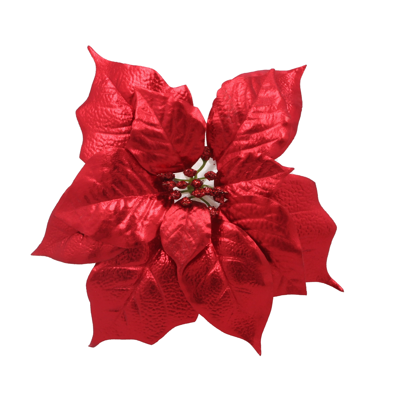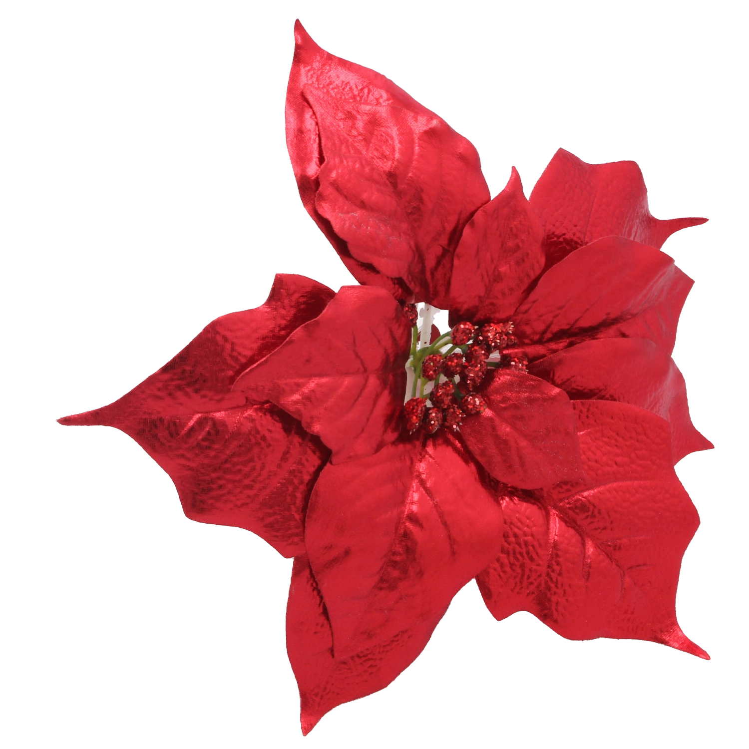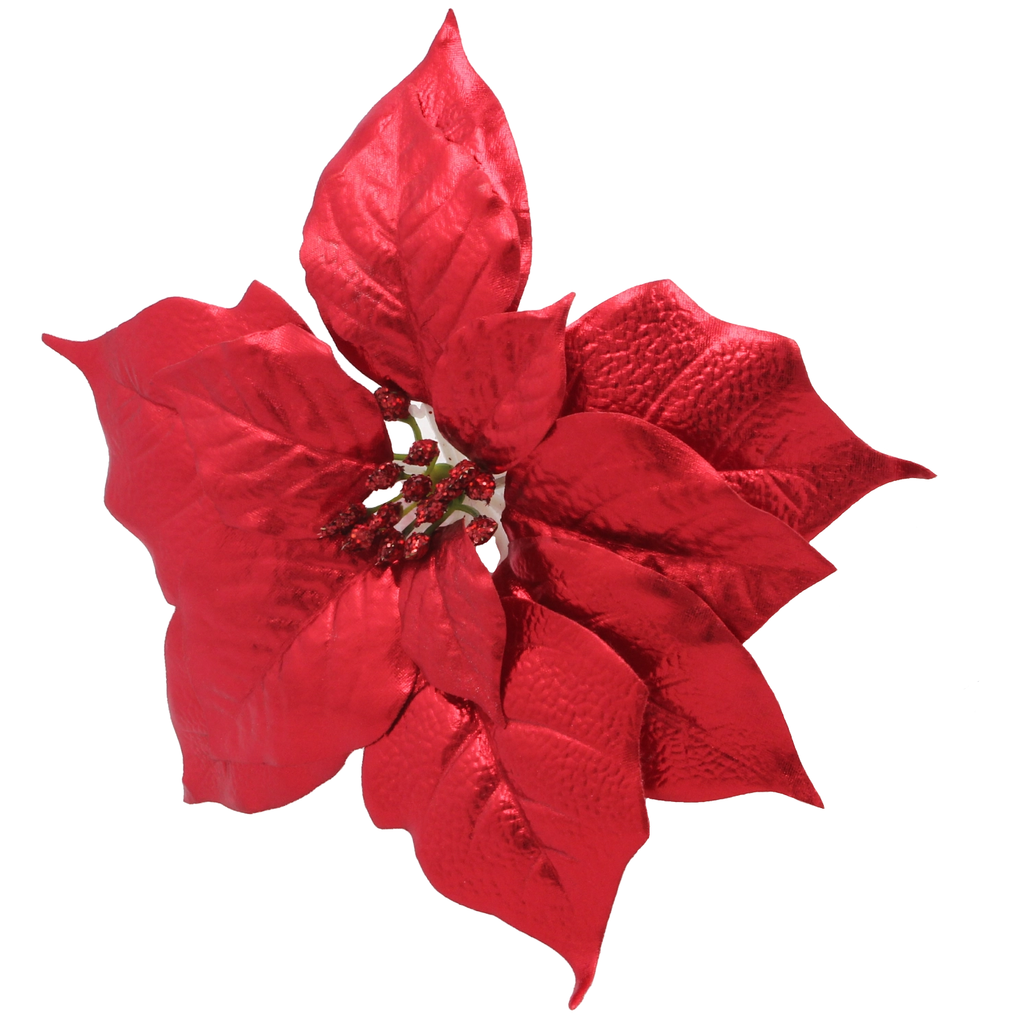 Textúrované okvetné lístky s jemným brokátom verne napodobňujú prírodnú poinsettiu a dodávajú aranžmá sviatočnú iskru.