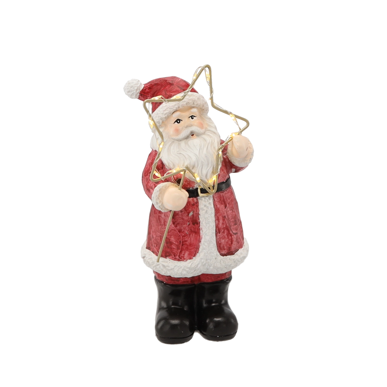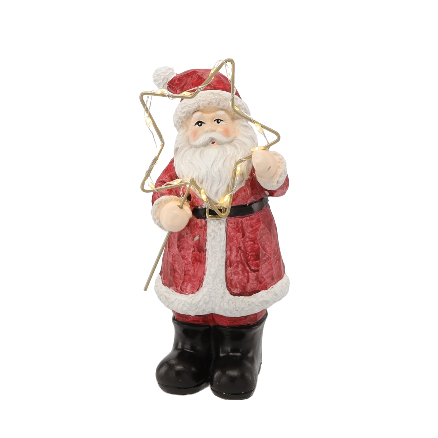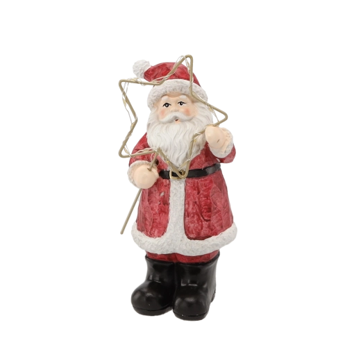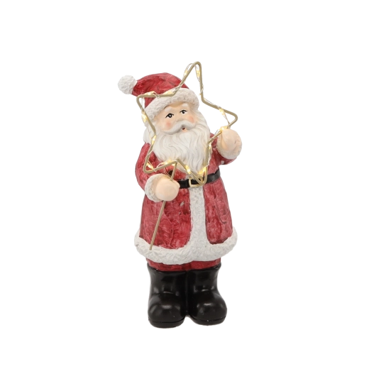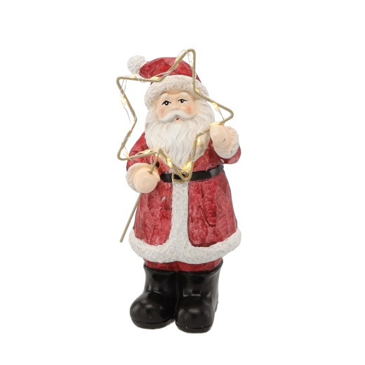 Táto vianočná figúrka Santu v klasickom červenom kabáte prináša do interiéru čaro Vianoc. Zlatá hviezda s LED svetlom jemne rozžiari okolie a zvýrazní detailne maľované prvky – od brady až po textúru odevu. Vďaka stabilnej základni je ideálna ako stolová dekorácia.