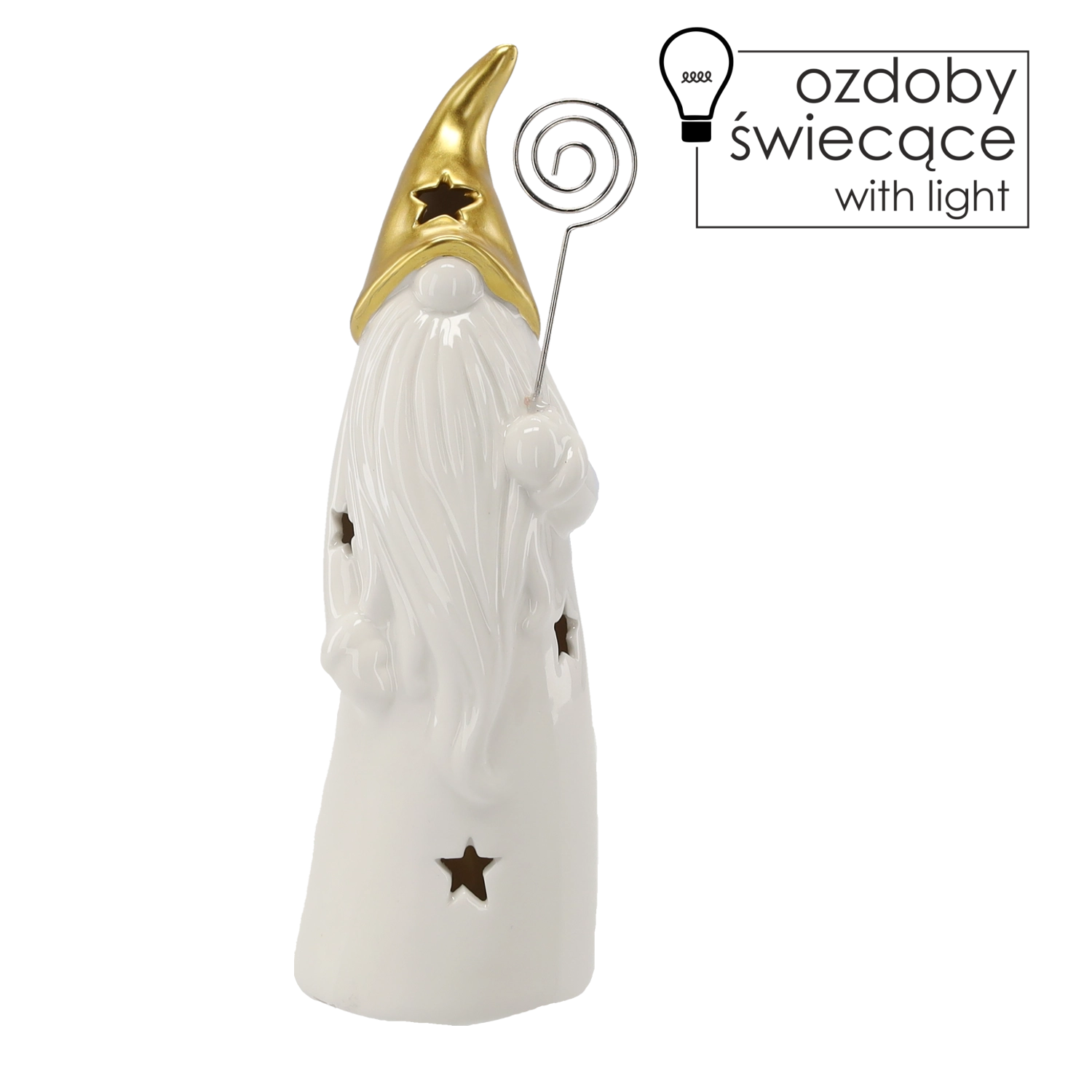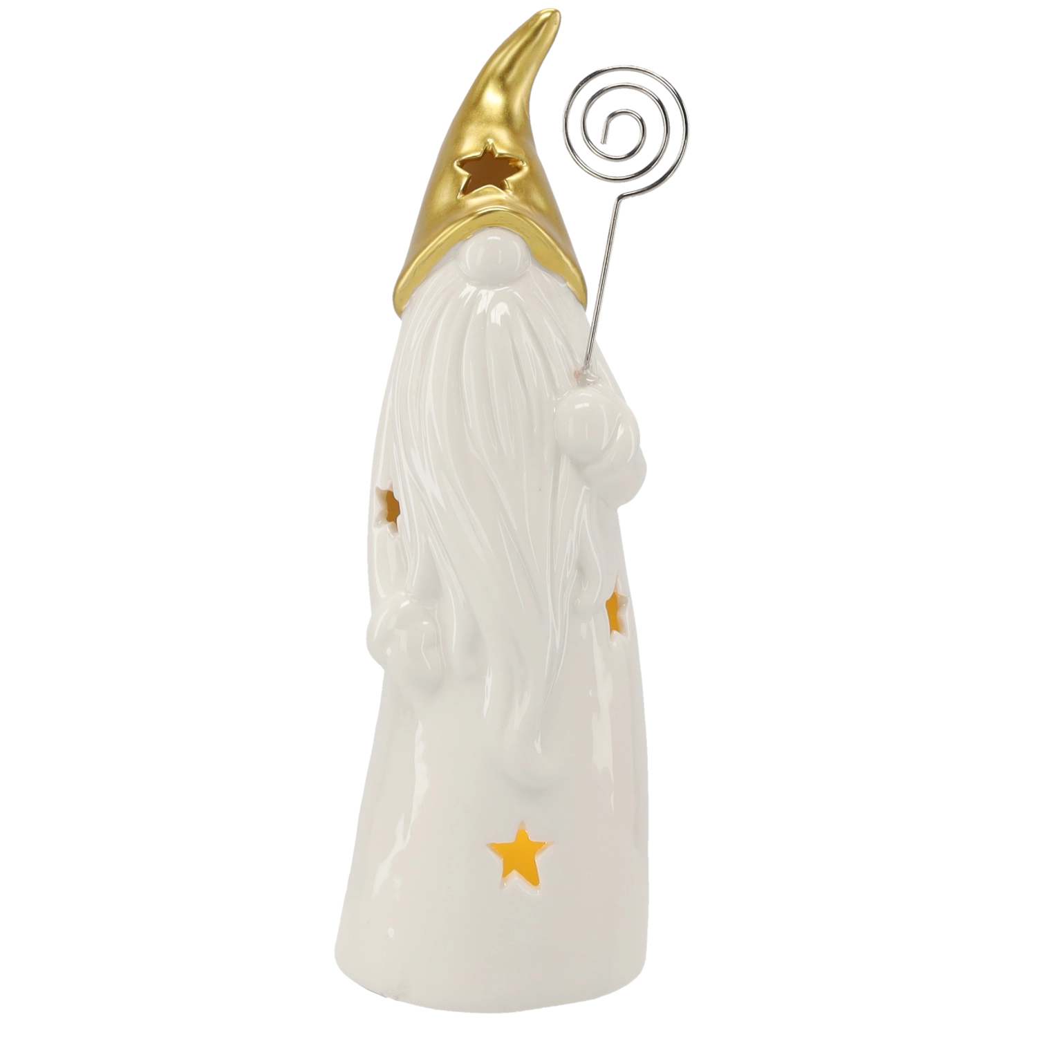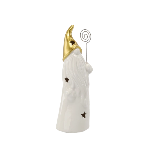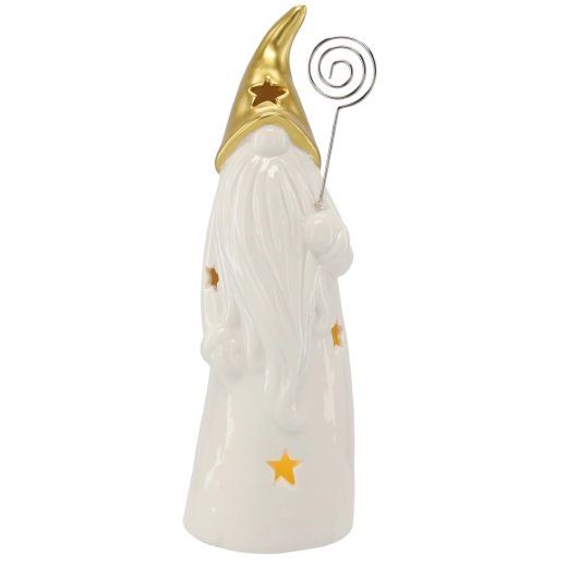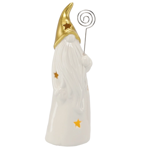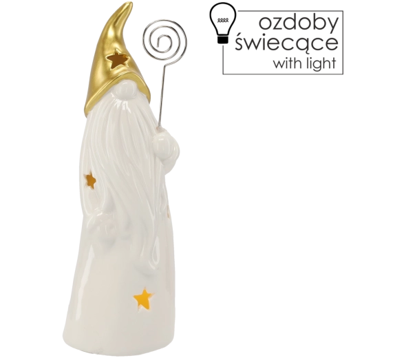 Dekoratívna keramická figúrka čarodeja so zlatou špicatou čiapkou, dlhým bielym bradom a hviezdičkovými výrezmi, ktoré po rozsvietení vytvárajú jemnú svetelnú atmosféru. Súčasťou je LED osvetlenie napájané batériami (v balení), ideálne pre vianočnú aj celoročnú dekoráciu na stôl, komodu či okenný parapet.