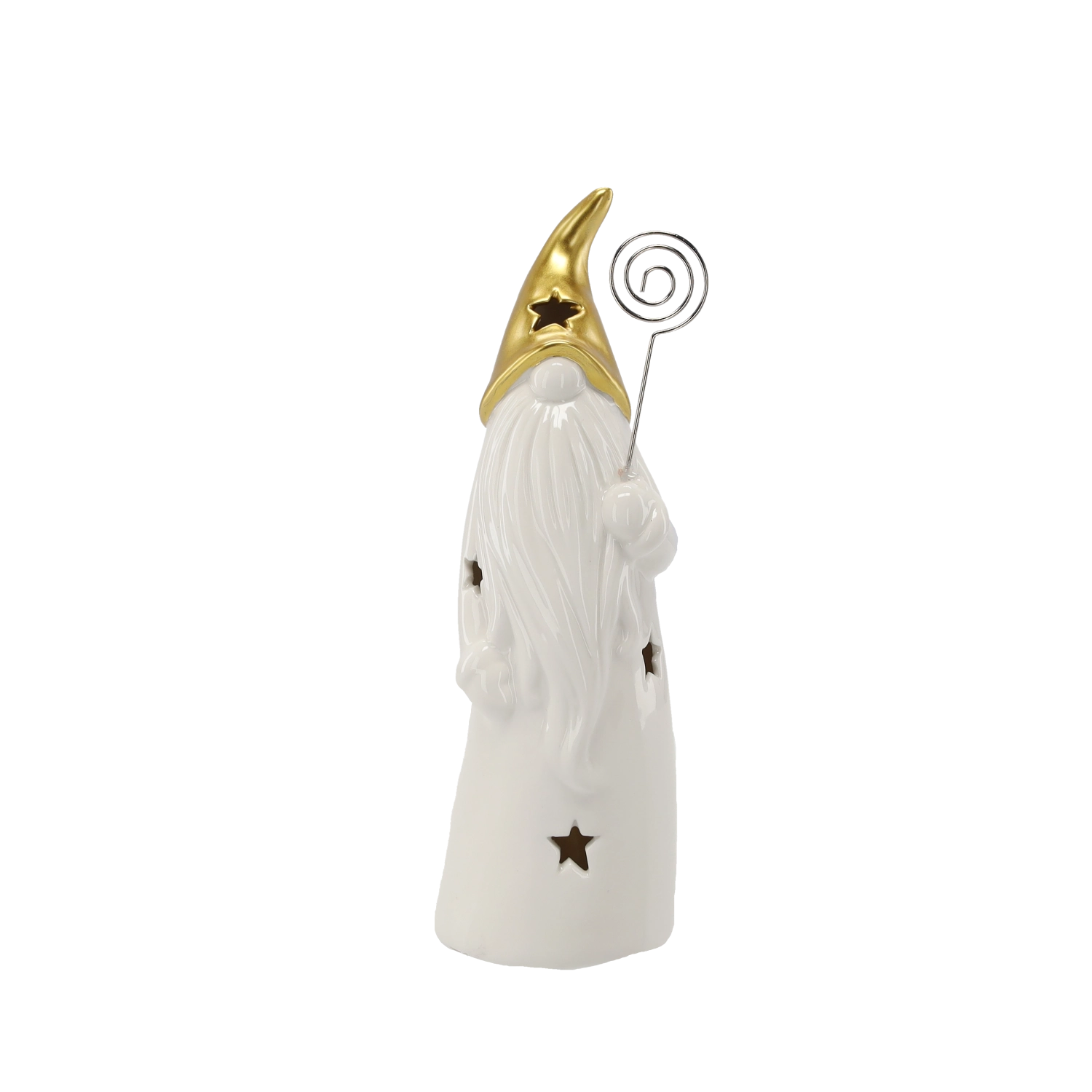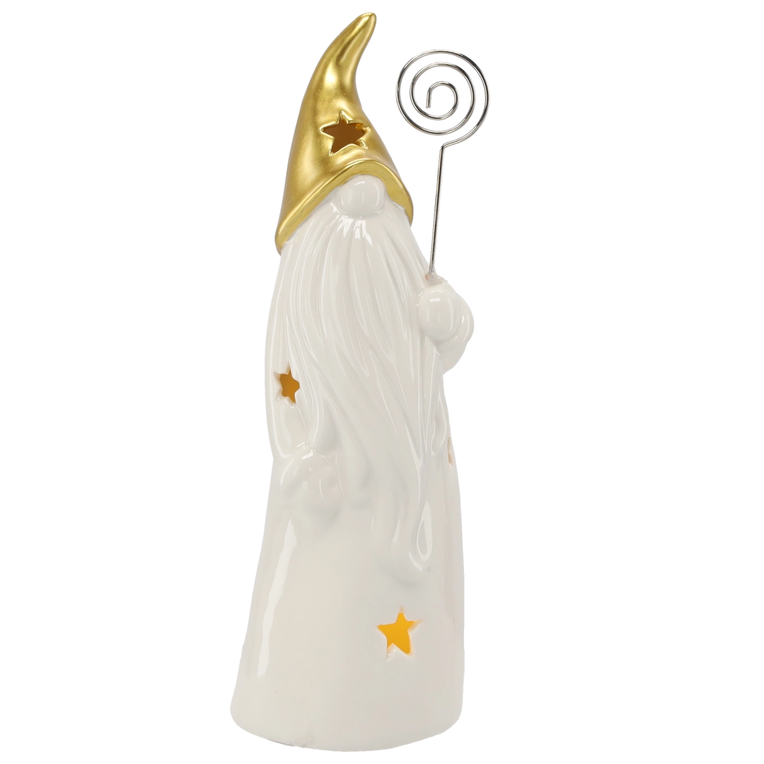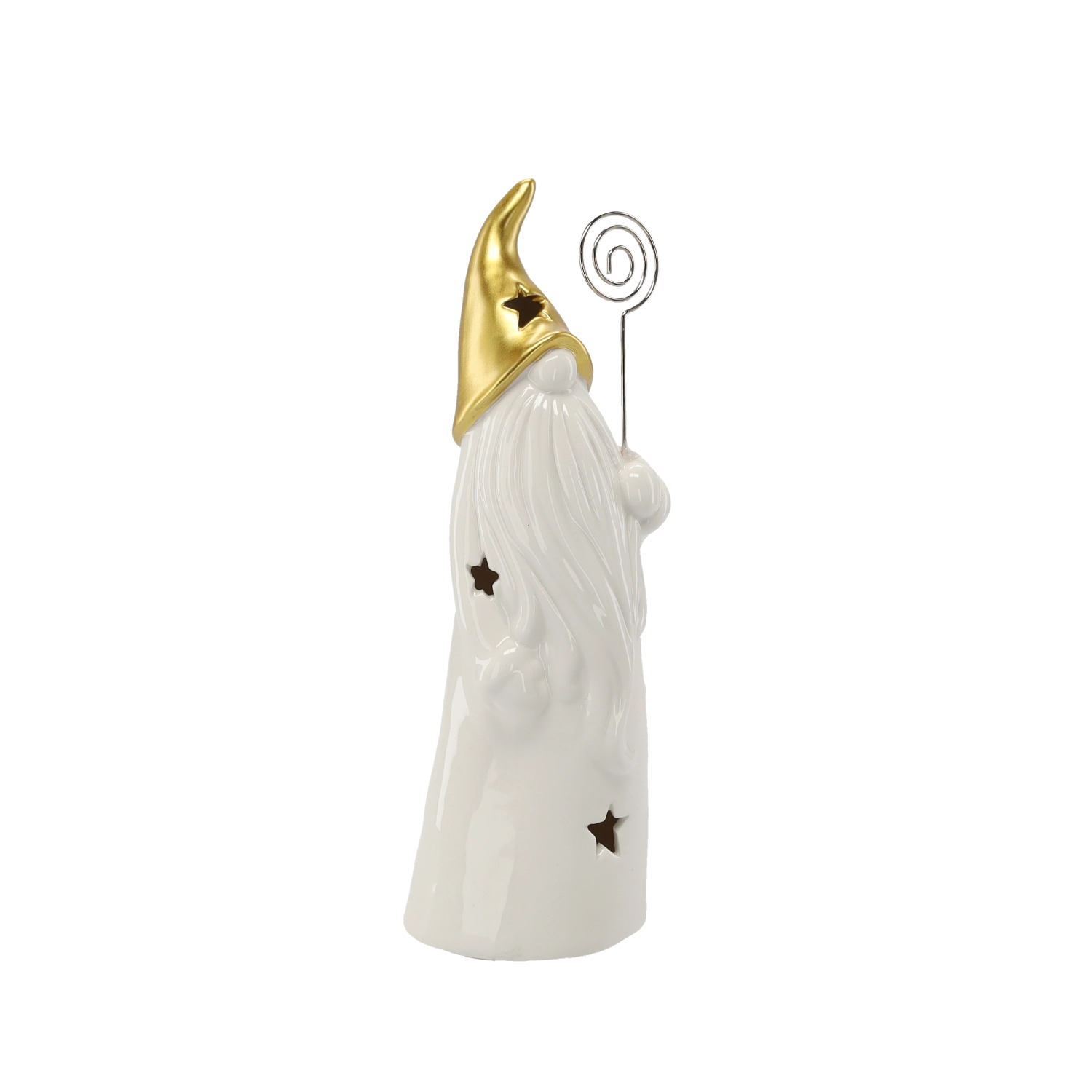 Dekoratívna keramická figúrka čarodeja so zlatou špicatou čiapkou, dlhým bielym bradom a hviezdičkovými výrezmi, ktoré po rozsvietení vytvárajú jemnú svetelnú atmosféru. Súčasťou je LED osvetlenie napájané batériami (v balení), ideálne pre vianočnú aj celoročnú dekoráciu na stôl, komodu či okenný parapet.