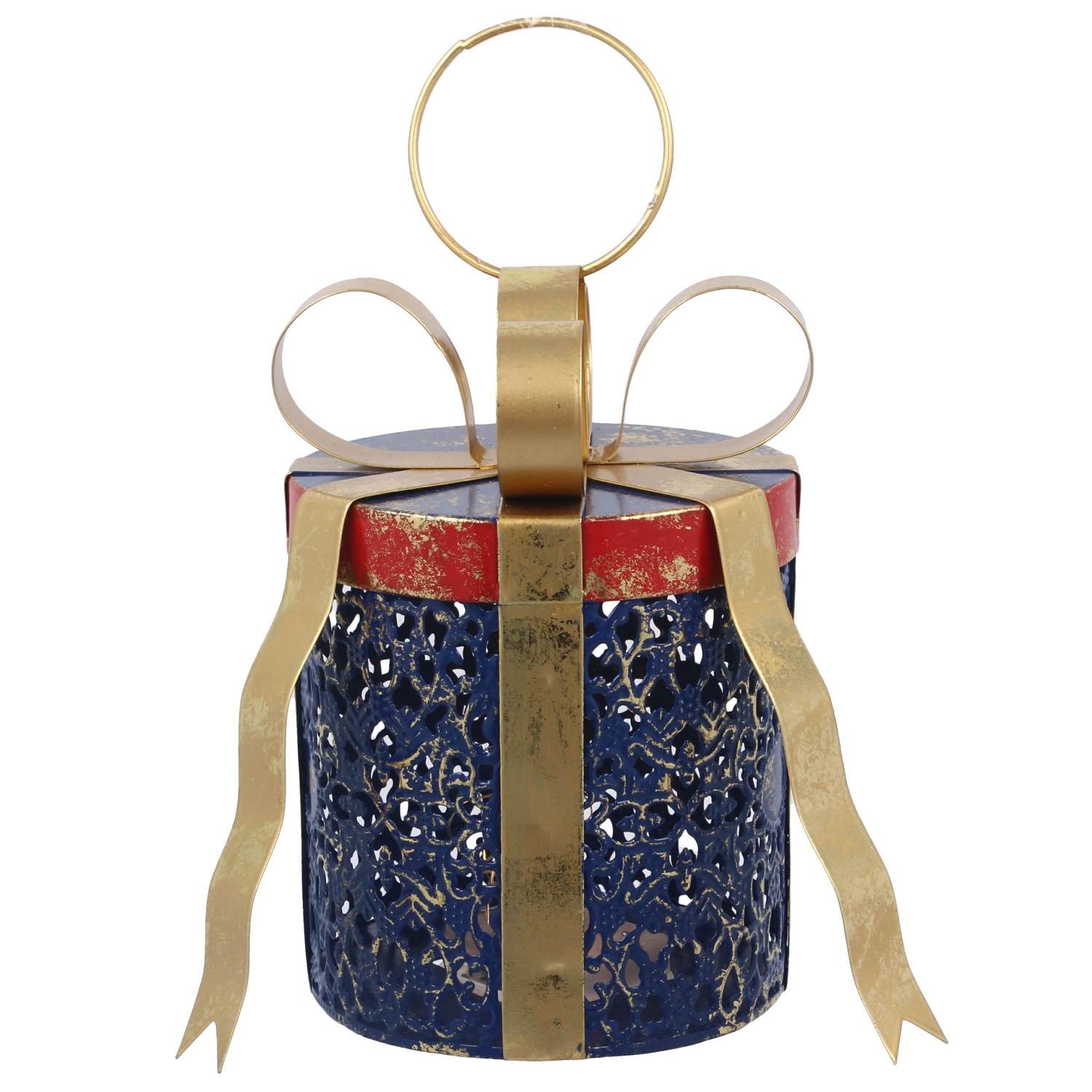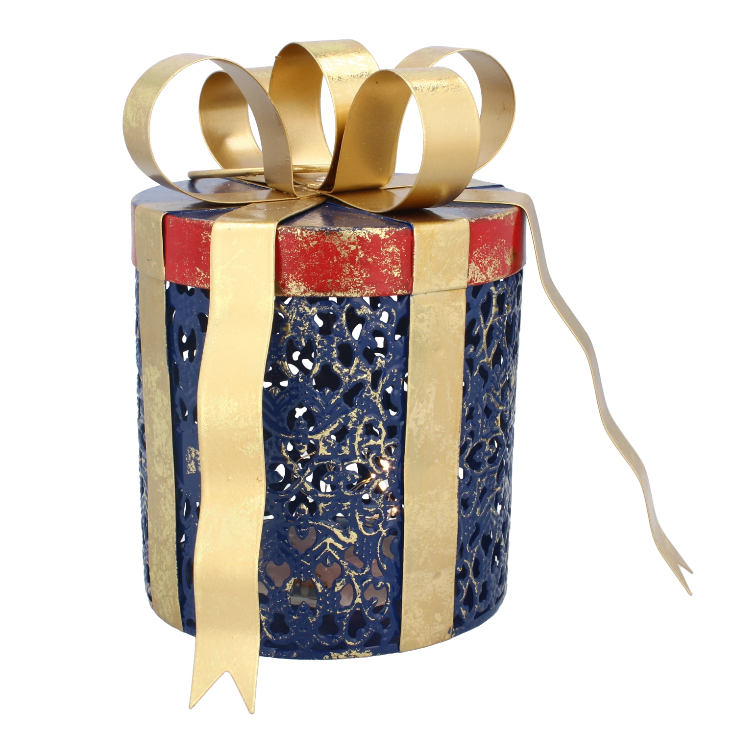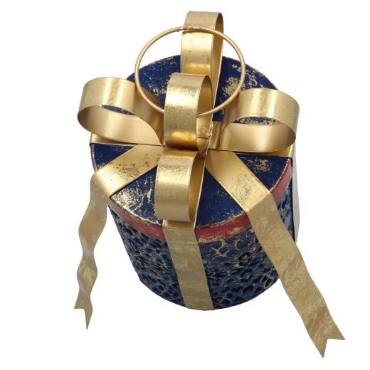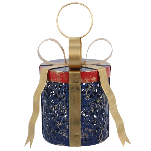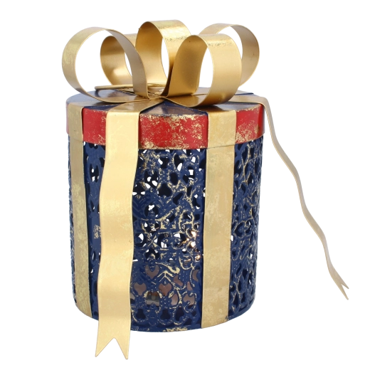 Štýlová vianočná dekorácia v podobe okrúhleho darčeka okamžite vytvorí útulnú sviatočnú atmosféru. Jemné teplé svetlo LED diód presvitá cez dekoratívne perforácie a dodáva interiéru príjemné teplo aj vizuálnu hĺbku. Kombinácia modrého kovu a zlatej mašle skvele ladí s tradičnými aj modernými aranžmánmi.