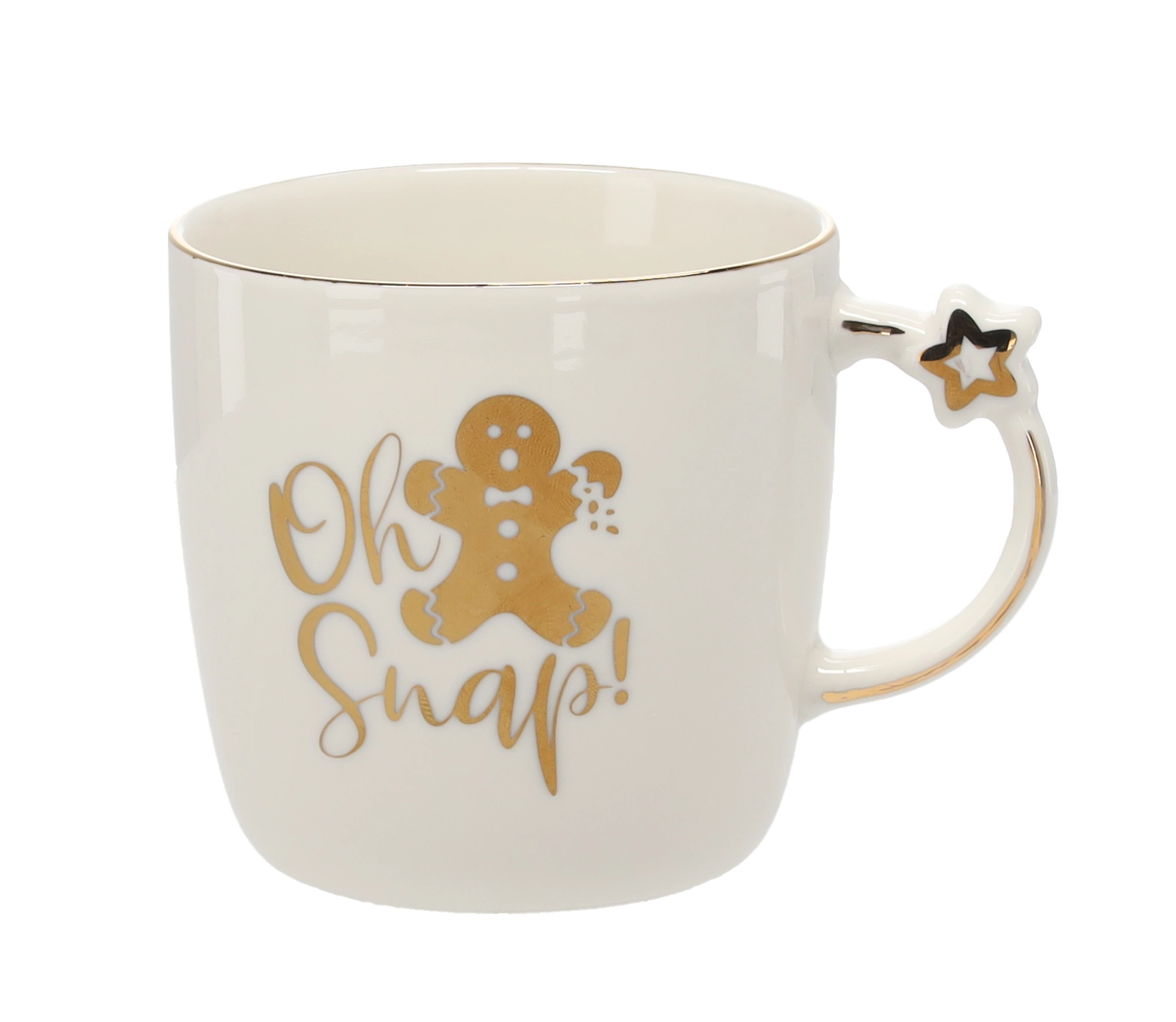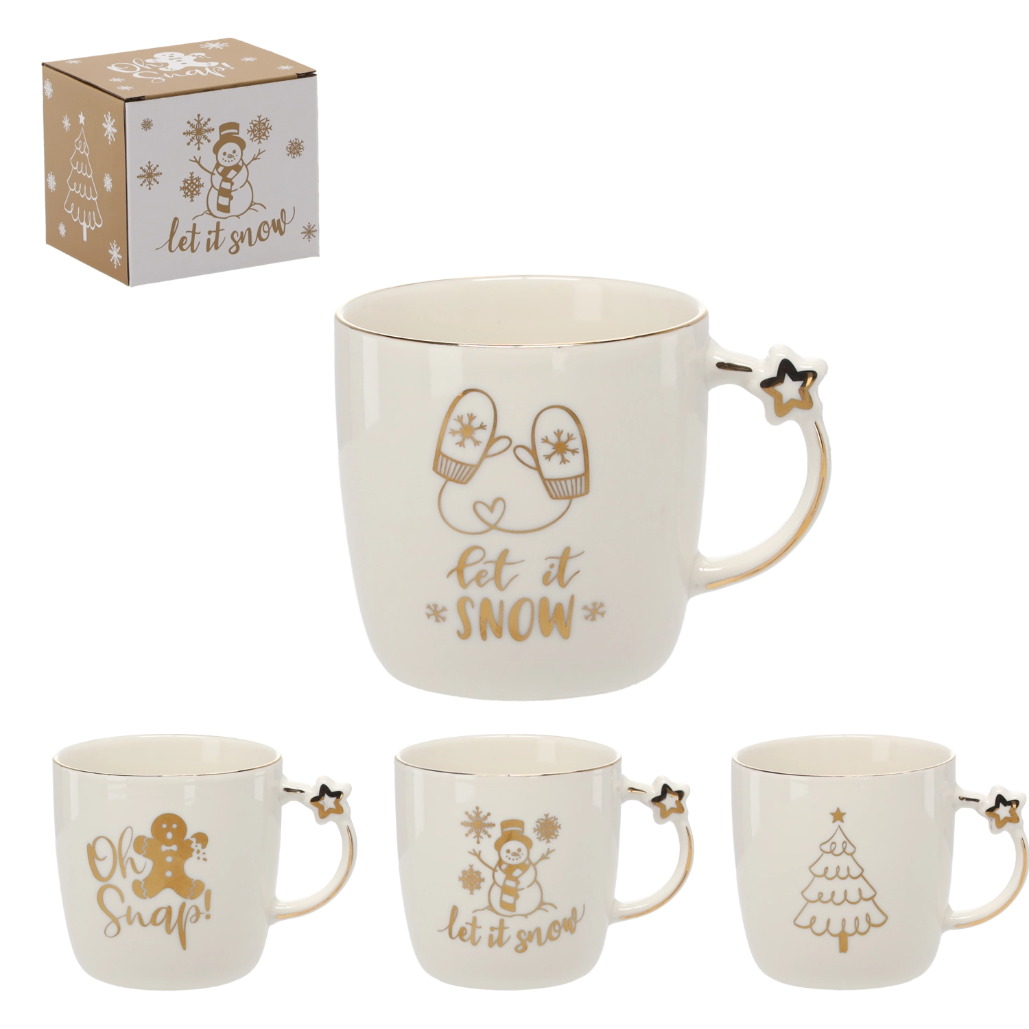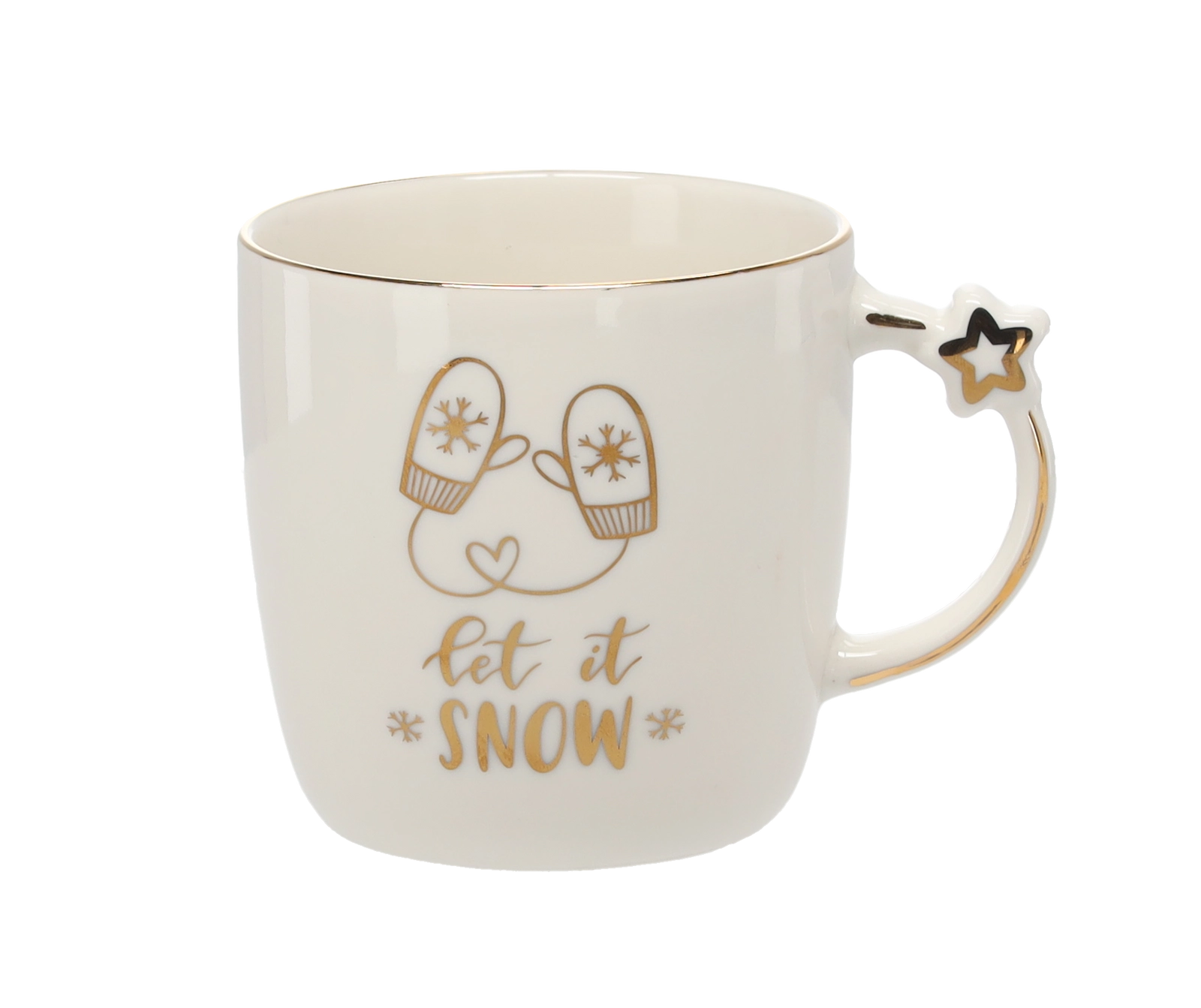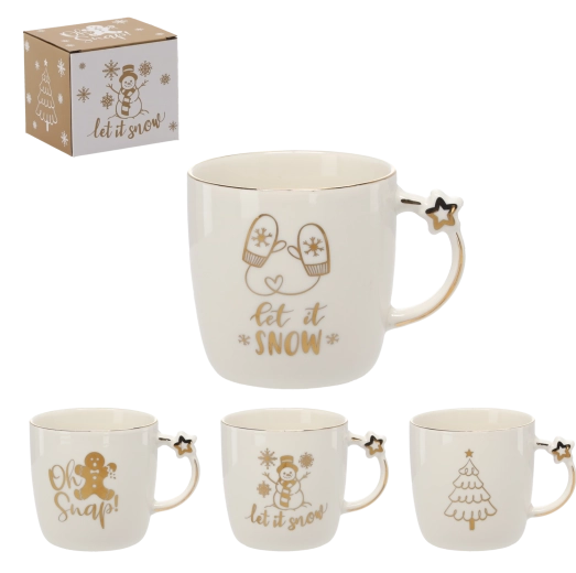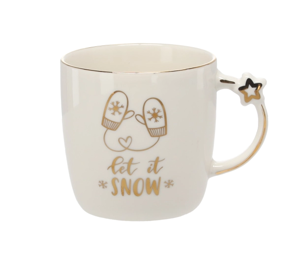 Užite si sviatočnú atmosféru pri každom dúšku. Porcelánový hrnček 360 ml kombinuje nadčasový biely základ so zlatými akcentmi a nápismi ako „Let it snow“ či „Oh Snap!“. Ergonomické uško s ozdobnou hviezdičkou padne pohodlne do ruky a hrnček vďaka kvalitnému spracovaniu udrží nápoj dlhšie teplý.