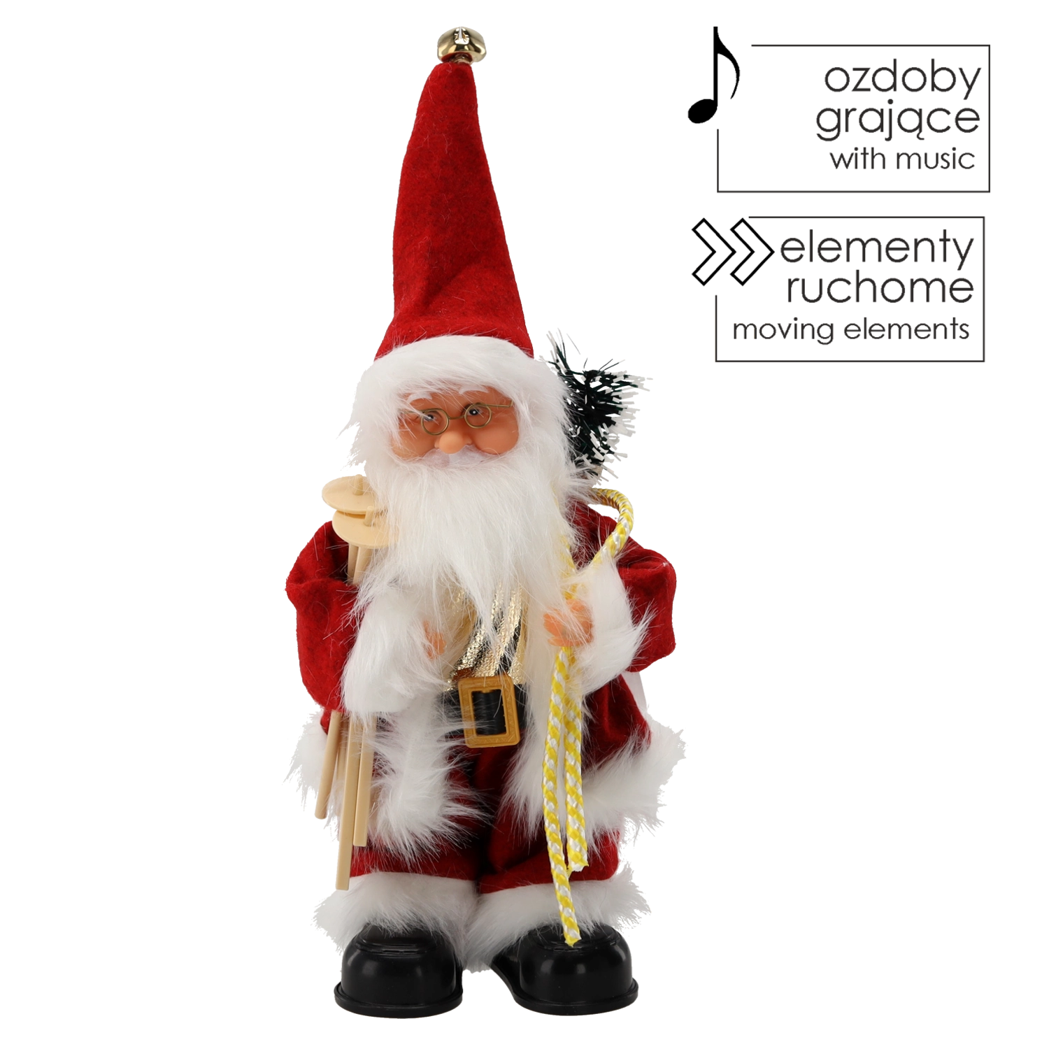 Hľadáte pôsobivú vianočnú dekoráciu, ktorá upúta pozornosť a rozžiari interiér? Hrajúca figúrka Santa s lyžami s výškou 30,5 cm prináša klasický sviatočný vzhľad v kombinácii s hudbou a pohybom. V rukách drží drevené lyže a na chrbte nesie vak s darčekmi – ideálny akcent na komodu, pod stromček alebo do výkladu.