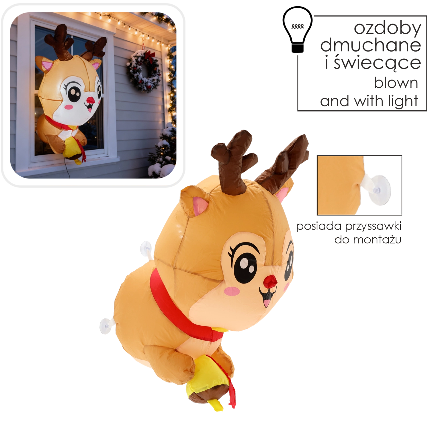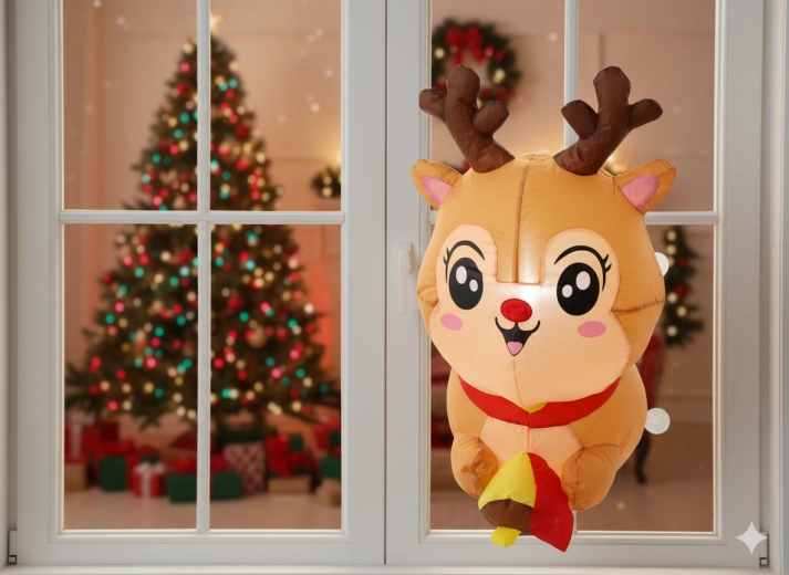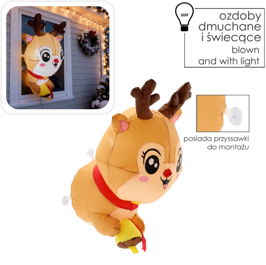 Okúzľujúci nafukovací sob s veľkými očami, parožím a červenou šálou rozžiari okná, výklady aj vstupy. Teplé LED svetlo vytvára príjemný večerný efekt a z diaľky priťahuje pozornosť. Inštalácia je otázkou chvíľky – vďaka prísavkám drží na hladkom skle či zrkadle bez náradia aj neporiadku.