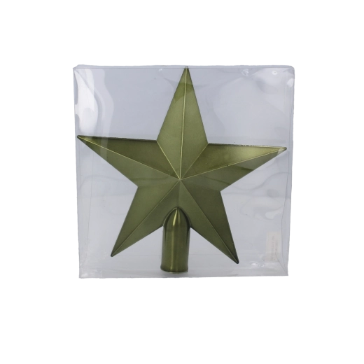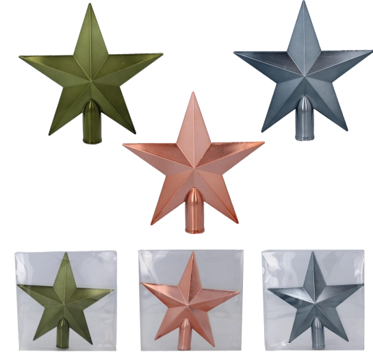 Elegantná vianočná špica v tvare hviezdy s výškou 20 cm dodá stromčeku moderný lesk a sviatočnú atmosféru. Ľahký a odolný plast zabezpečuje jednoduchú inštaláciu a dlhú životnosť. Dostupná v troch sofistikovaných farbách: olivová, medená a grafitová – ideálna pre väčšinu interiérov.