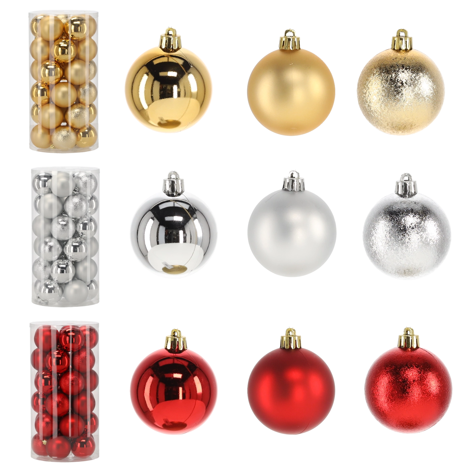 Elegantná súprava 30 vianočných ozdôb s priemerom 6 cm v kombinácii červenej, zlatej a striebornej farby dodá stromčeku tradičný a slávnostný vzhľad. Ľahký a odolný plastový materiál je bezpečný do domácností s deťmi aj domácimi miláčikmi, zatiaľ čo lesklý povrch a rôzne vzory a textúry vytvárajú čarovnú hru svetiel a bohatý vizuálny efekt.