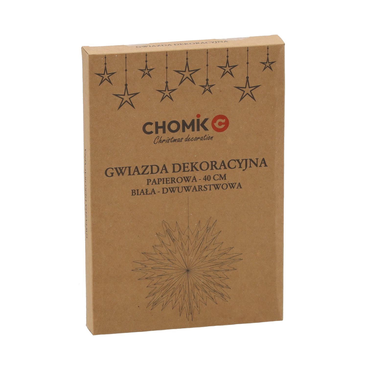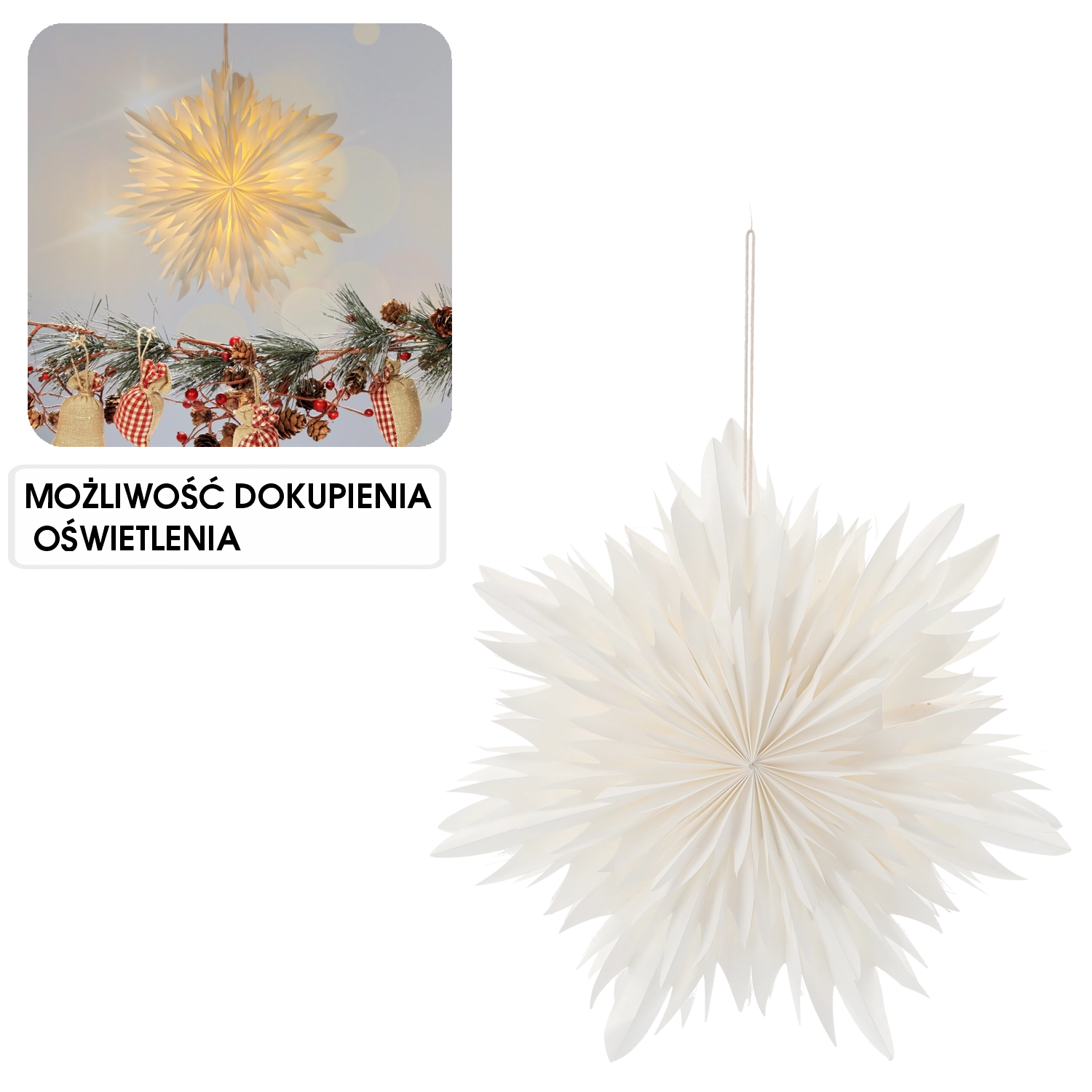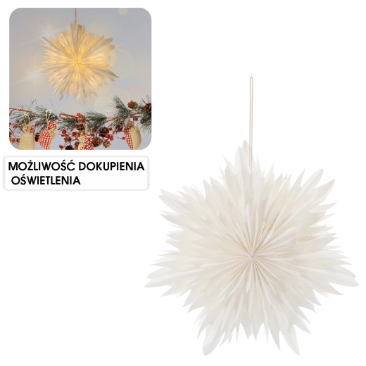 Objavte čistú eleganciu v podobe bielej papierovej hviezdy, ktorá okamžite zútulní každý priestor. Ľahký papier s premysleným skladaním vytvára výrazný 3D efekt a krásne odráža svetlo. Ideálna na zavesenie do okna, nad stôl či do výkladu.