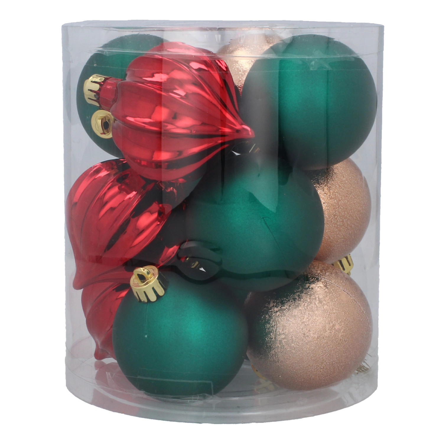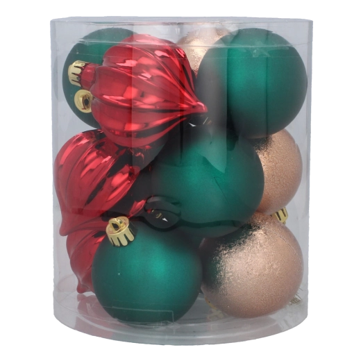 Táto vyvážená sada ozdôb prináša harmóniu tradičných farieb a povrchov, ktoré krásne odrážajú svetlo a vytvárajú útulnú vianočnú atmosféru. Vďaka odolnému plastu sú baňky ľahké, ľahko sa zavesujú a menej náchylné na poškodenie než sklenené varianty.