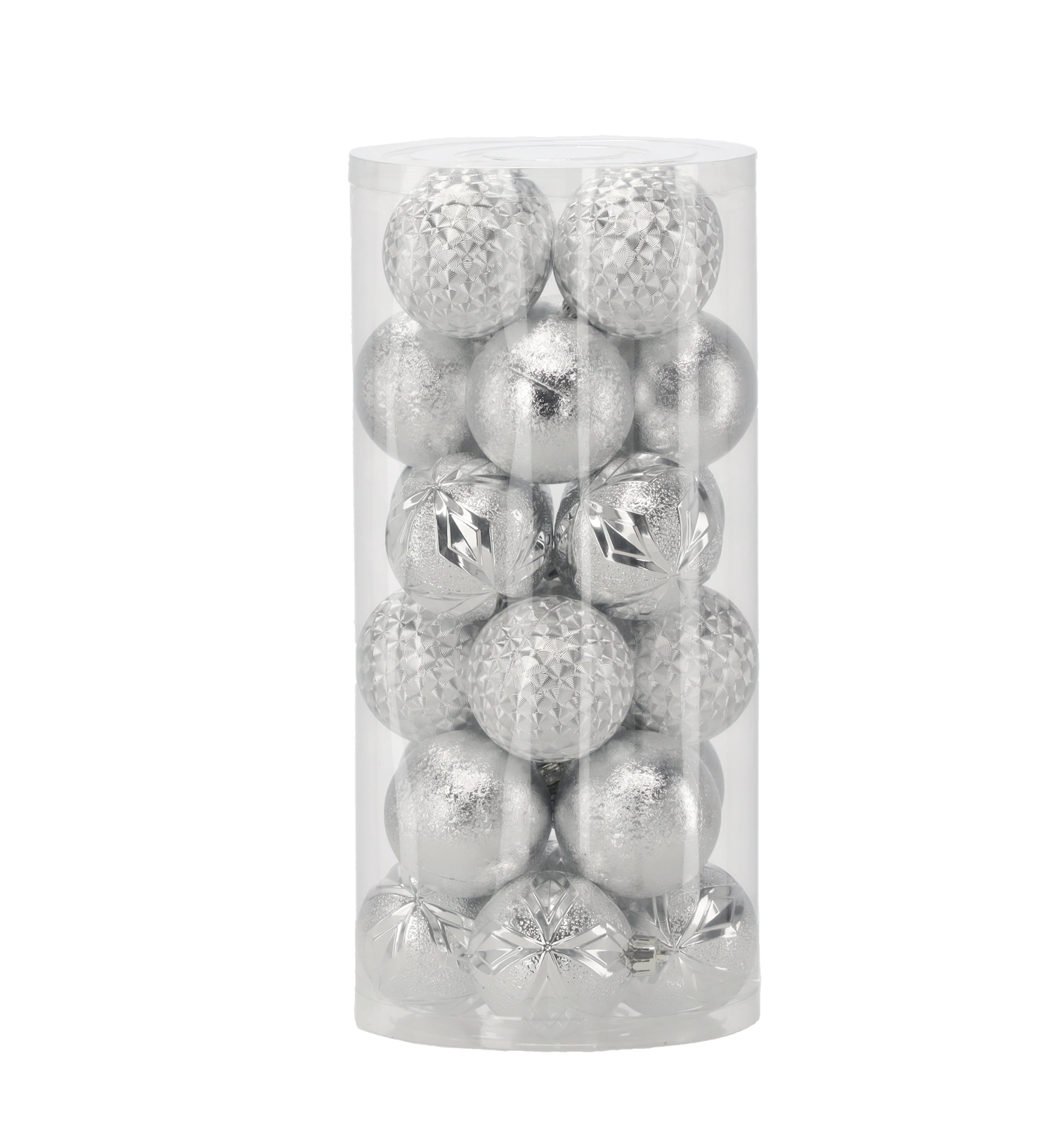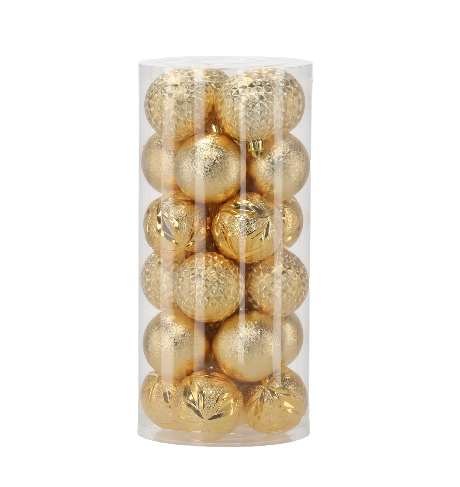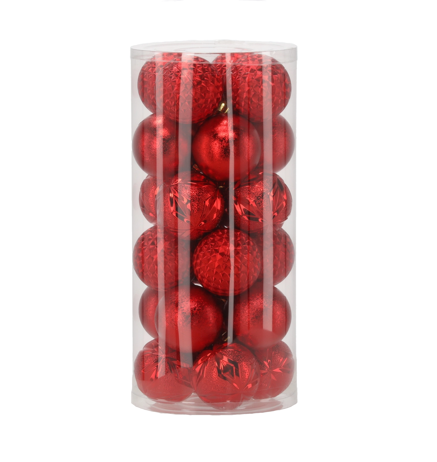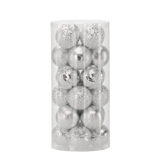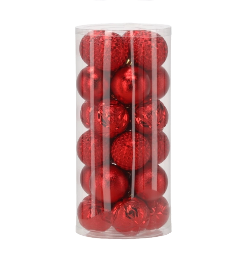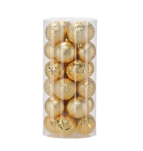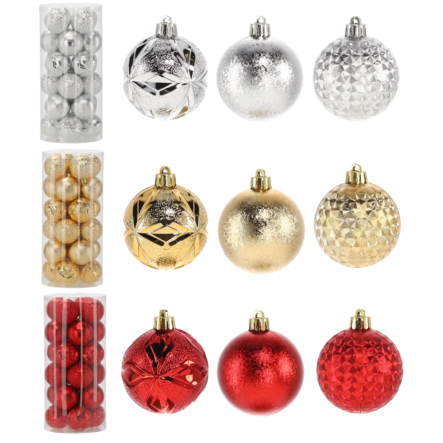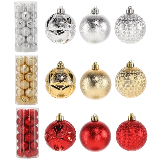 Táto elegantná sada obsahuje 24 kusov vianočných gulí s priemerom 6 cm v nadčasovej kombinácii červenej, zlatej a striebornej. Rôzne povrchové úpravy ako lesk, štruktúrovaný povrch a trblietky dodajú vášmu stromčeku hĺbku aj iskru a pomôžu vytvoriť harmonickú výzdobu.