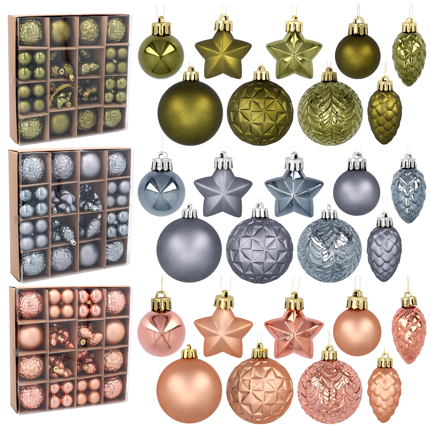 Táto univerzálna súprava zahŕňa pestrú paletu ozdôb v trendových odtieňoch, ktoré spolu perfektne ladia. Kombinácia matných, lesklých a štruktúrovaných povrchov pomáha vytvoriť harmonický a nadčasový vzhľad vášho vianočného stromčeka aj sviatočnej výzdoby.