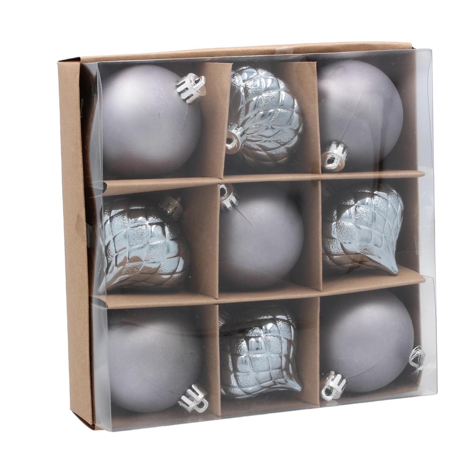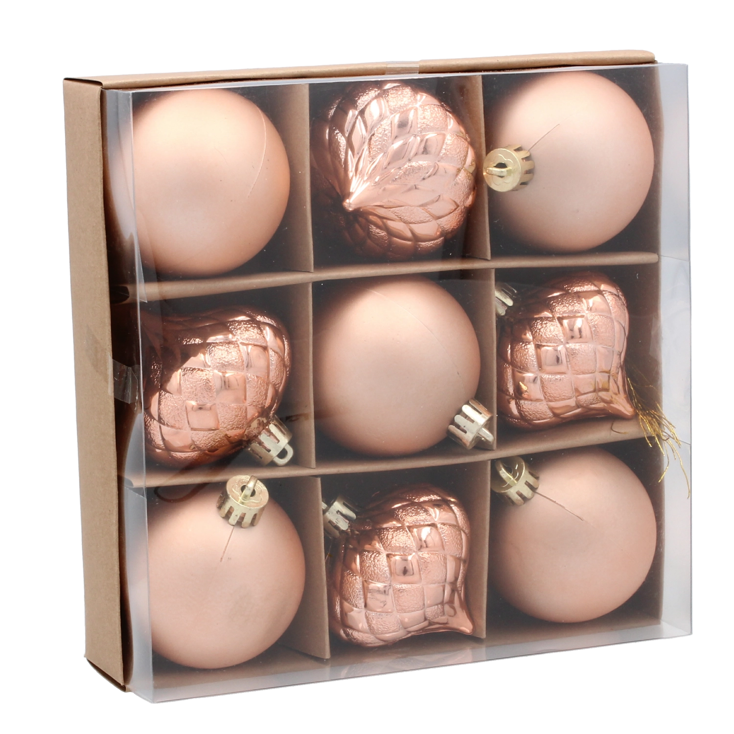Rôznorodé reliéfne a hladké vzory dodajú dekoru hĺbku a iskru, takže stromček pôsobí plnšie a štýlovejšie bez potreby ďalších doplnkov.