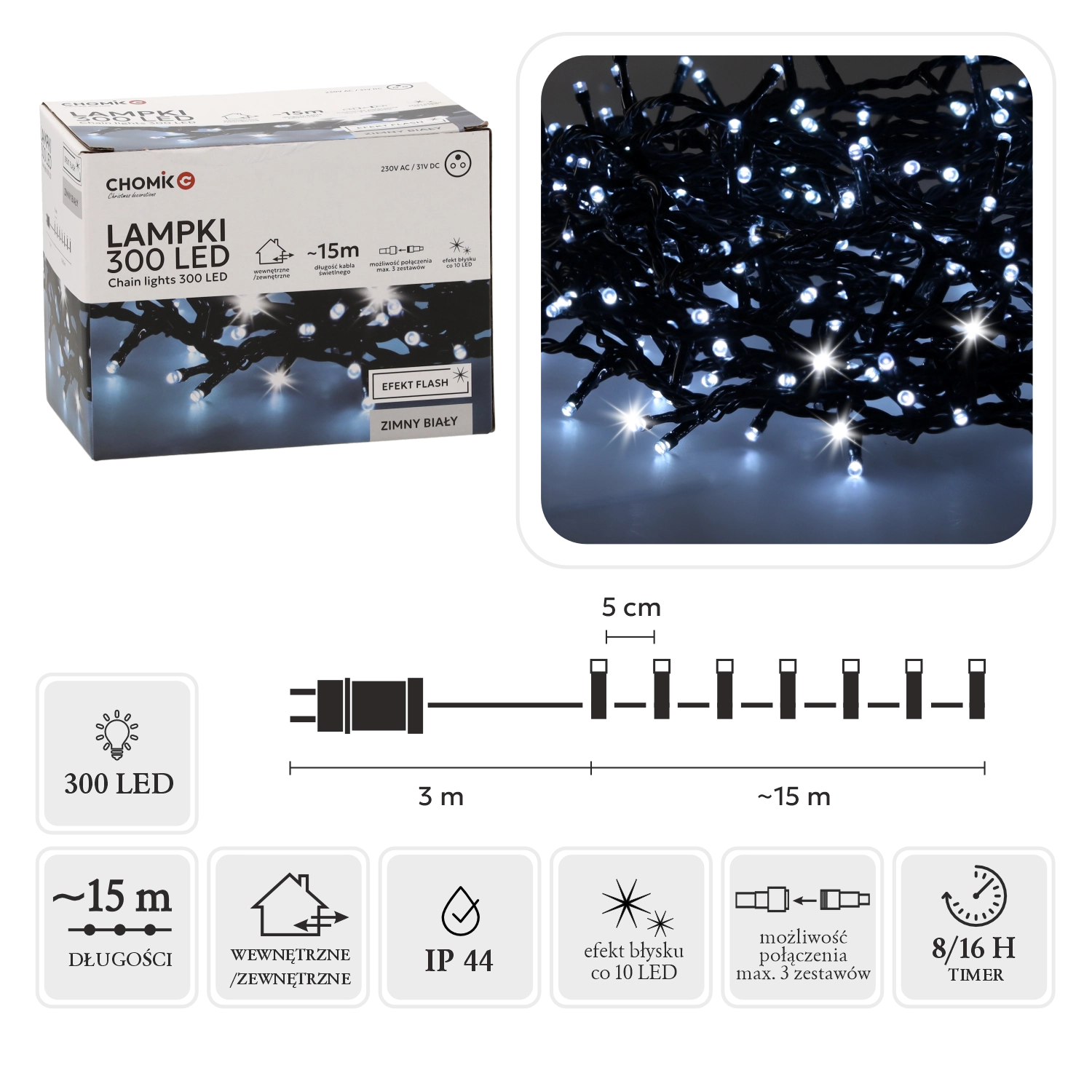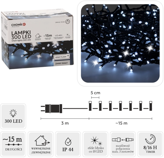 Táto univerzálna LED svetelná reťaz s 300 kvalitnými diódami v farbe studená biela a efektom studeného flash je ideálna na dekoráciu domu, záhrady, stromčekov aj okien. Celková dĺžka 18 m (z toho 15 m svietiacej časti) poskytne dostatok svetla pre väčšie plochy, zatiaľ čo 3 m napájací kábel uľahčí umiestnenie k zásuvke.