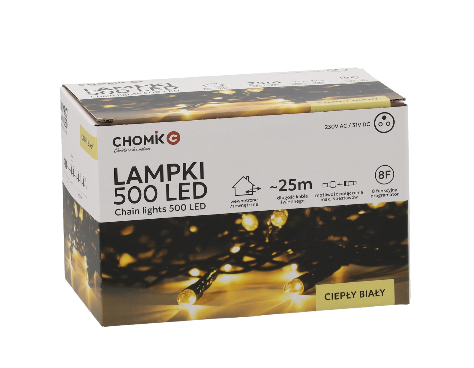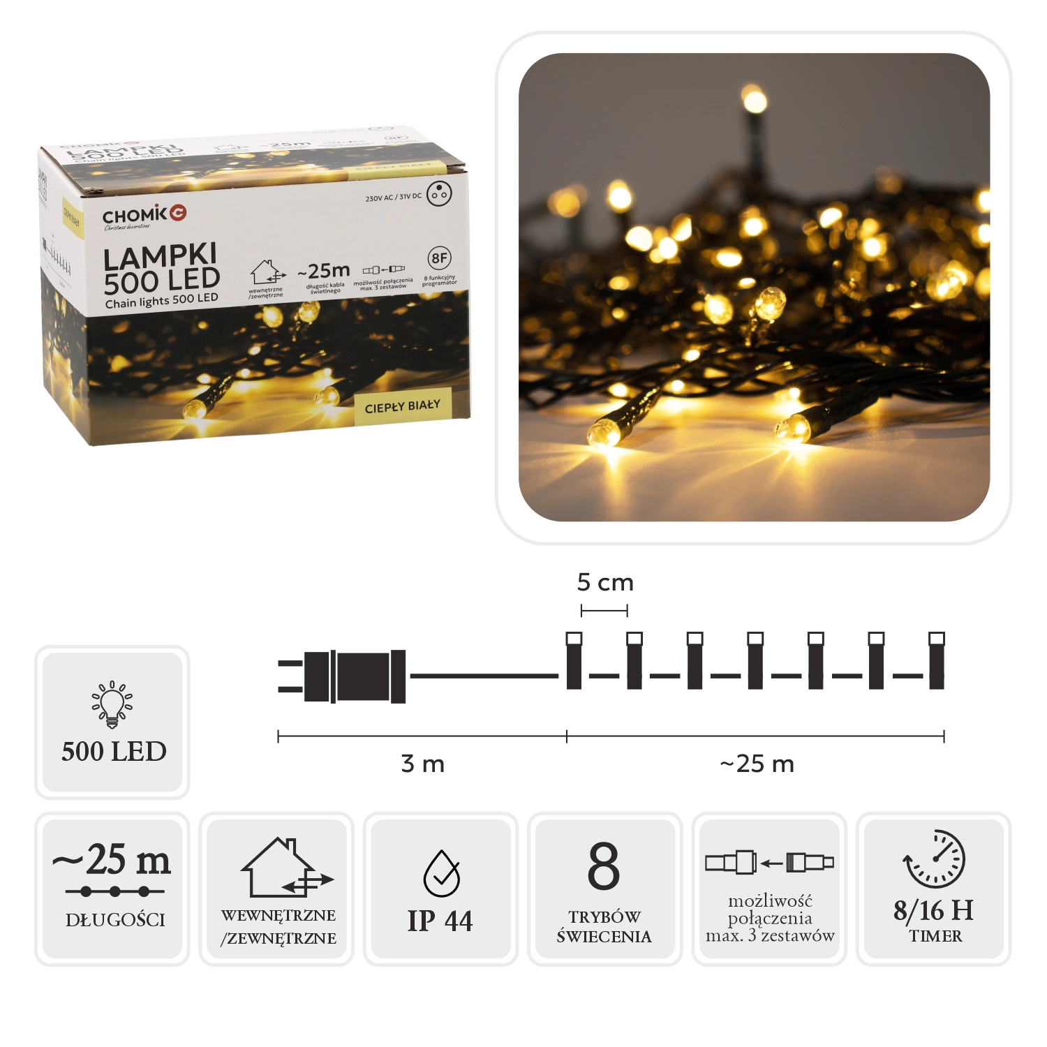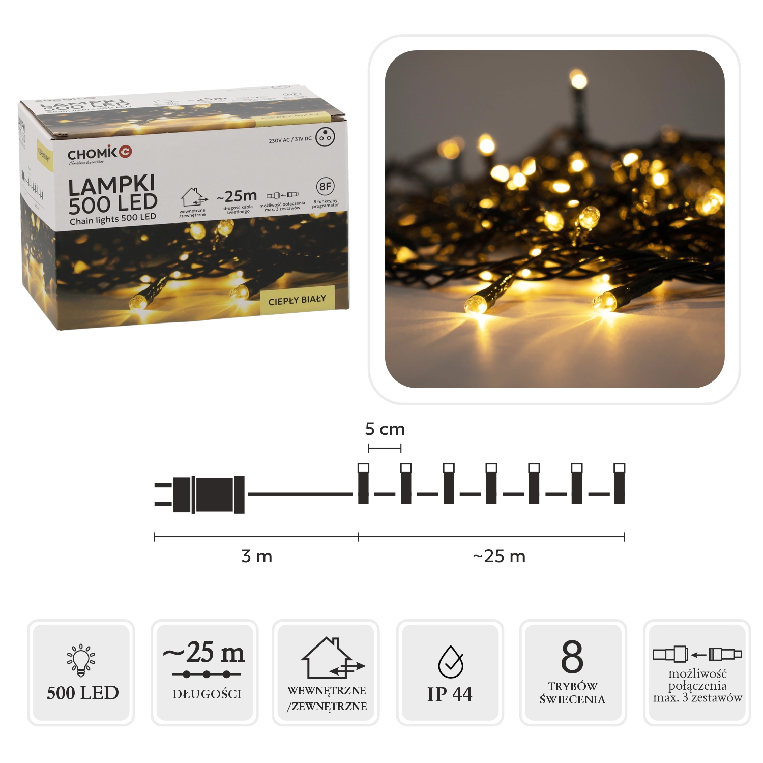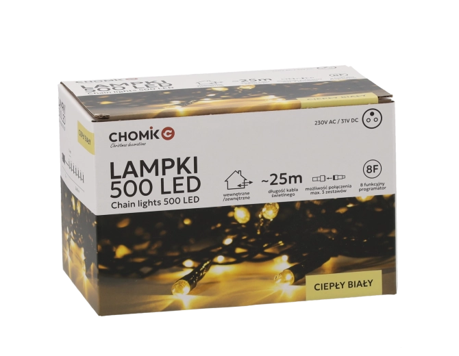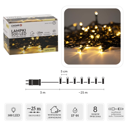 Hľadáte spoľahlivé a elegantné vianočné osvetlenie? Tento LED svetelný reťaz s 500 diódami v teplej bielej farbe dodá vášmu priestoru útulnú a sviatočnú atmosféru. Vďaka dĺžke svetelnej časti 25 m a rozstupu 5 cm rovnomerne pokryje stromček, fasádu aj zábradlie.