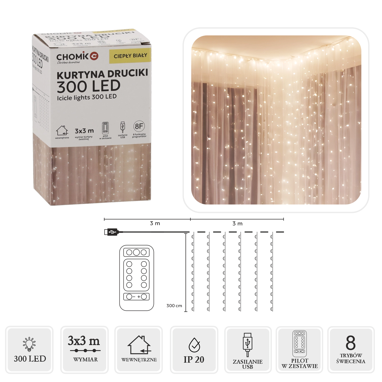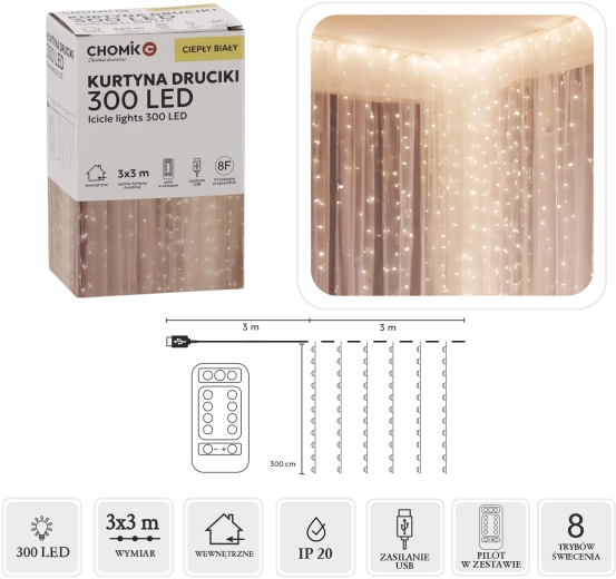 Vytvorte čarovnú atmosféru doma aj vonku so svetelnou závesnou girlandou o rozmeroch 3 × 3 m s až 300 mikro LED v teplej bielej farbe. Praktické napájanie USB, diaľkový ovládač a 8 režimov svietenia vám umožnia ľahko navoliť ideálnu náladu pre každú príležitosť. Elegantný strieborný drôt decentne splynie s dekoráciou a zvýrazní moderný vzhľad.