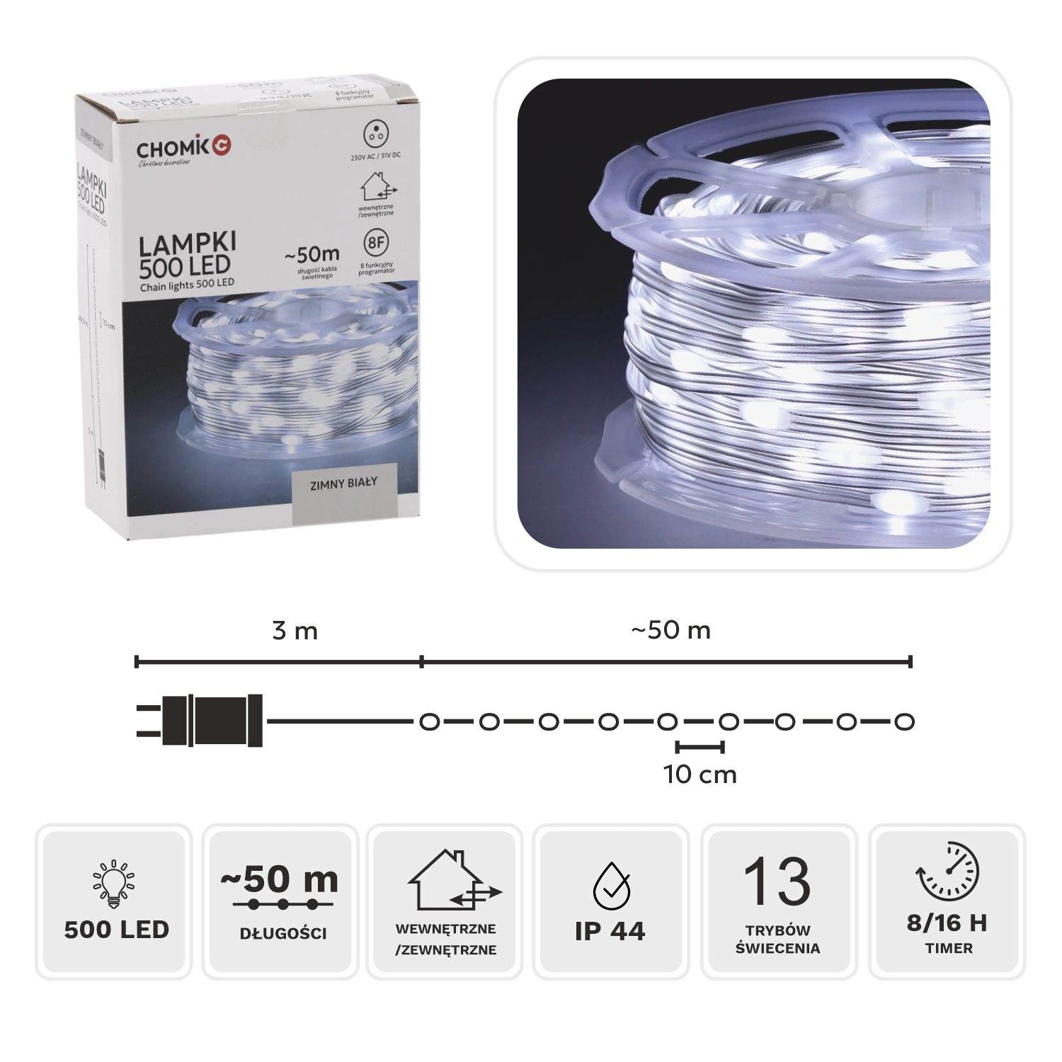 LED mikro svetelná reťaz na praktickej cievke prináša rovnomerné studeno biele osvetlenie na dĺžke 50 metrov. Vďaka vysokému počtu 500 diód s rozstupmi 10 cm sa skvele hodí na stromčeky, zábradlia, pergoly aj výklady. Priehľadná izolácia elegantne splynie s prostredím a nechá vyniknúť iba svetlo.