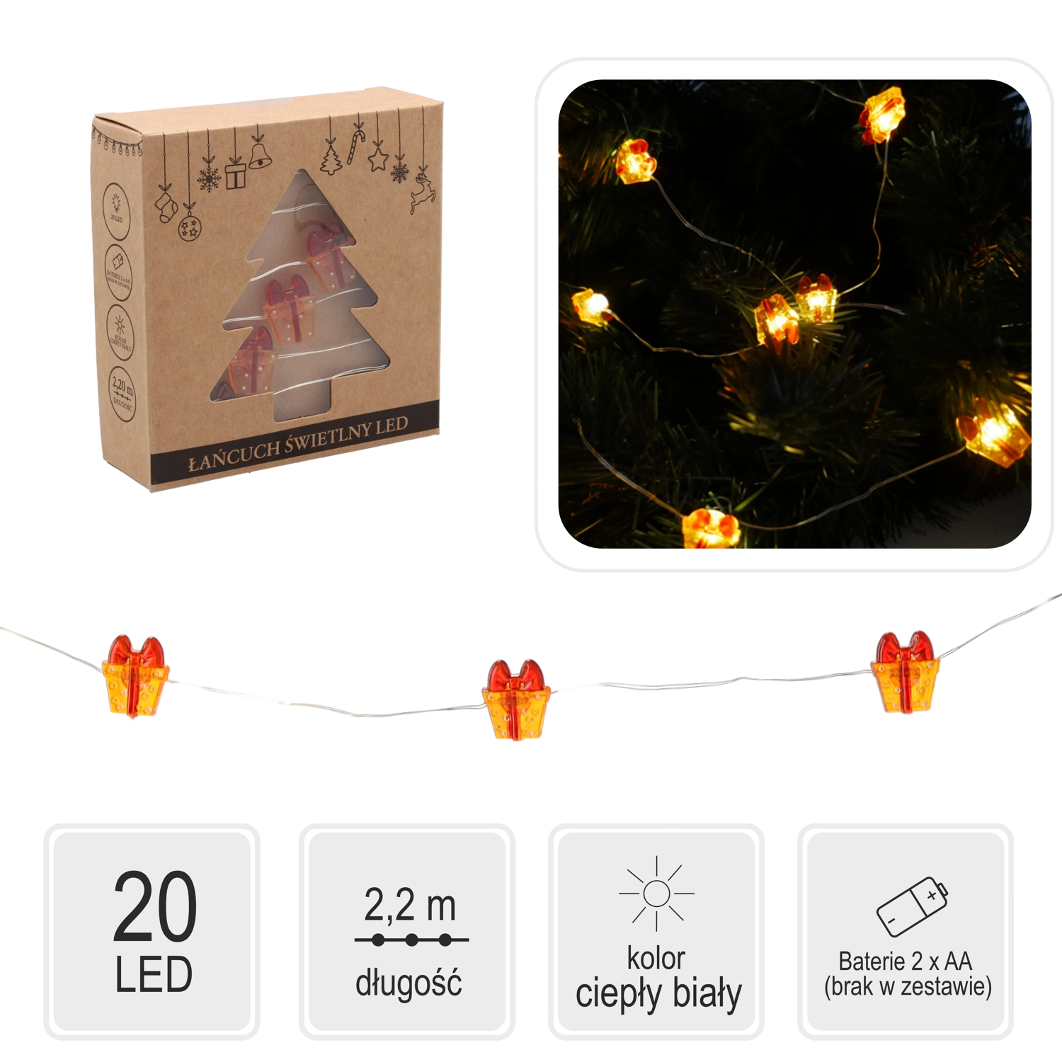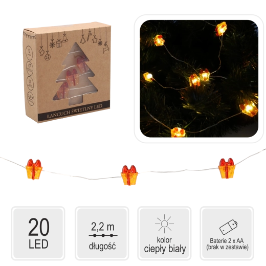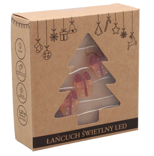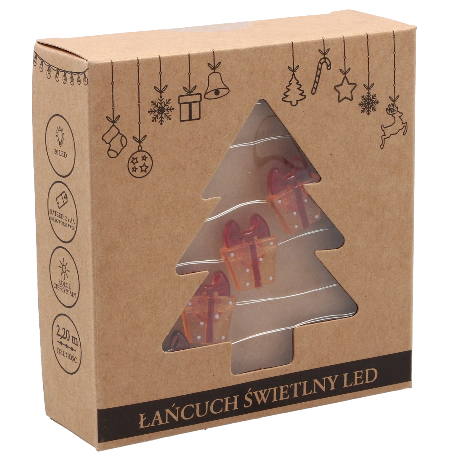 Rozžiarte domov vianočnou atmosférou so svetelným reťazom s motívom darčekov. 20 teplých bielych LED vytvára útulné náladové svetlo, batériové napájanie umožní dekorovať kdekoľvek – na stromčeku, okne, polici aj vo venci.