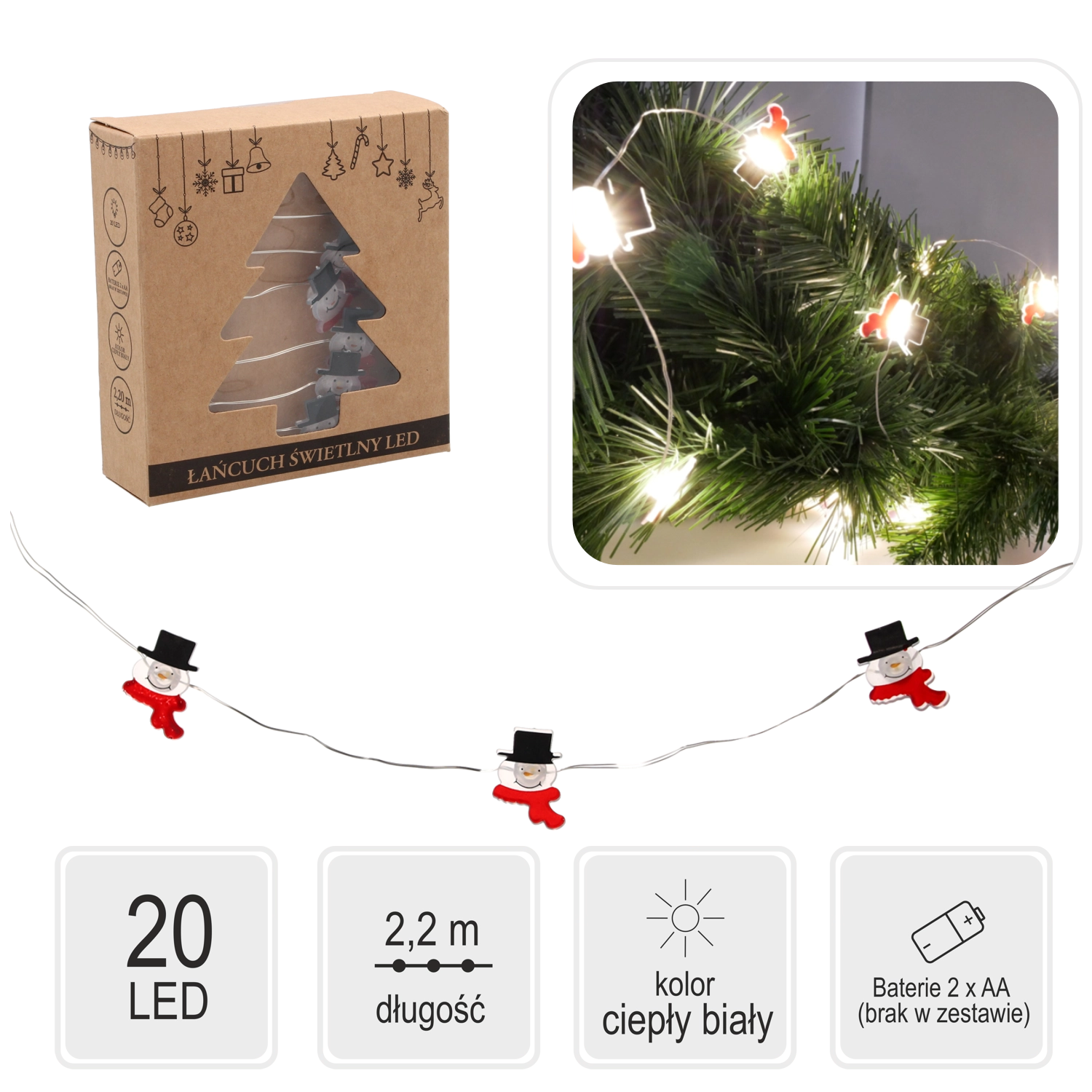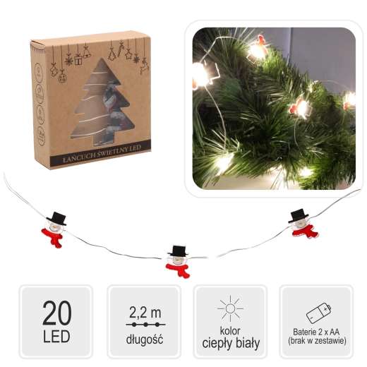 Táto dekoratívna reťaz prináša do interiéru čarovnú sviatočnú atmosféru. Každá dióda je ozdobená motívom snehuliaka, ktorý vytvára útulný teplý jas a rozžiari detské izby, obývacie steny aj sviatočné aranžmány. Vďaka napájaniu 2× AA nie ste viazaní na zásuvku – ideálne na miesta, kde nechcete viditeľné káble.
