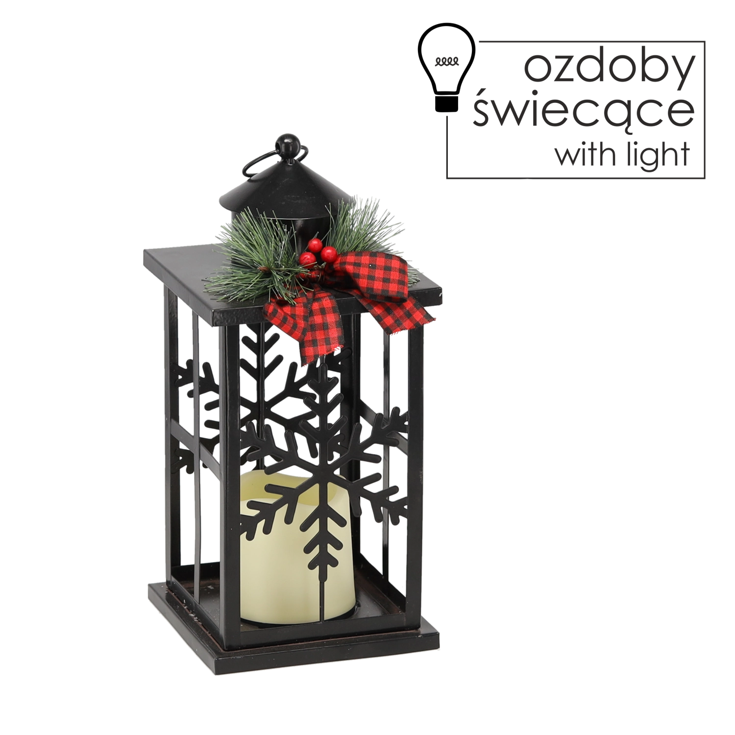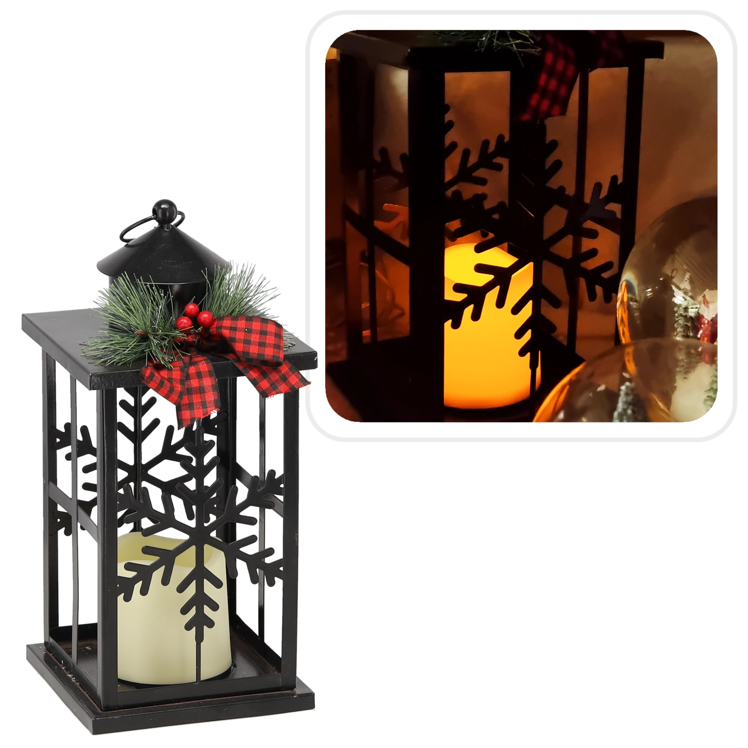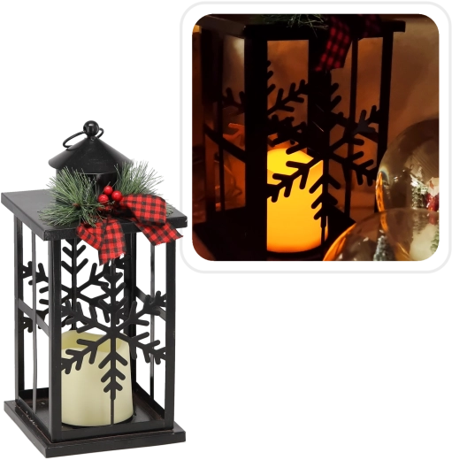 Elegantný vianočný lampáš v čiernom kovovom prevedení prinesie do vášho domova útulné svetlo a sviatočnú atmosféru. Dekor zdobia jemné motívy snehových vločiek, štýlová stužka a teplé LED osvetlenie, ktoré je bezpečné a úsporné. Ideálny ako dekorácia na stôl, komodu či okenný parapet.