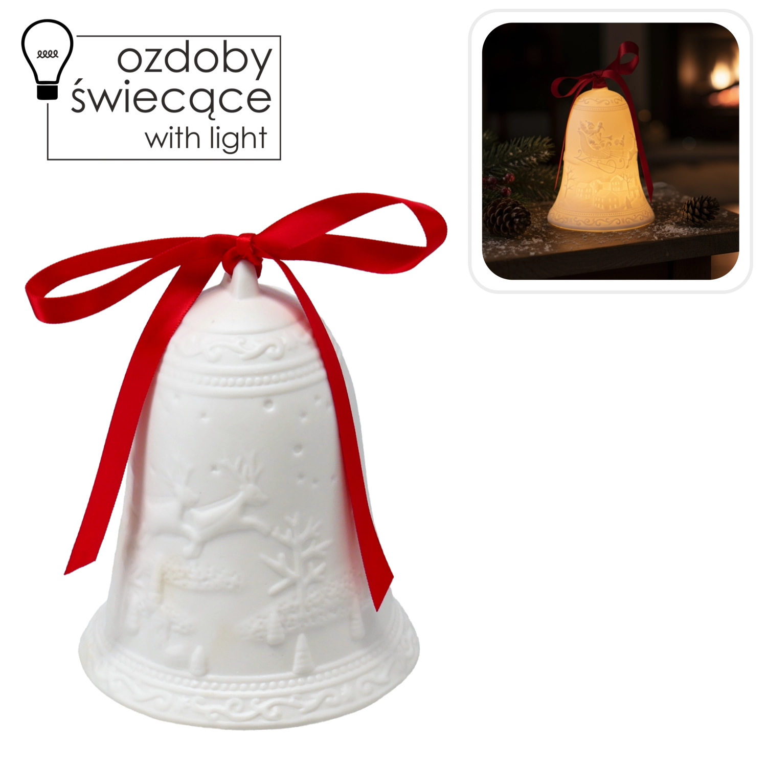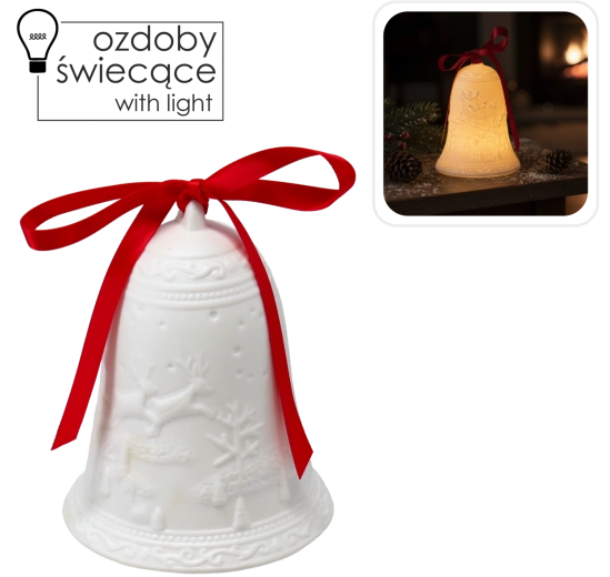 Tento keramický vianočný zvonček očarí detailným reliéfom a teplým LED svetlom, ktoré dodá vášmu interiéru útulnú, slávnostnú náladu. Vďaka integrovanému LED osvetleniu je bezpečný a energeticky úsporný – ideálny na dlhé zimné večery.