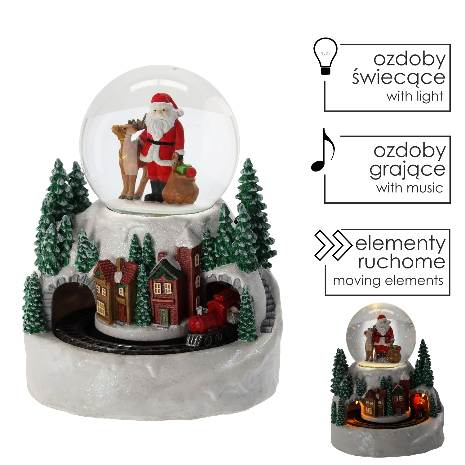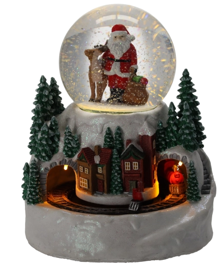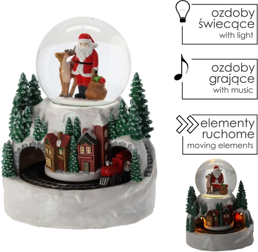 Táto detailne spracovaná snehová guľa s motívom SANTU a zimnej dedinky očarí dospelých aj deti. Integrované LED svetlo vytvára hrejivý svit, zatiaľ čo mini vláčik obieha okolo podstavca a dodáva scéne život. Dekorácia ponúka 3 prevádzkové režimy, takže si môžete vychutnať svetlo a pohyb s hudbou alebo v tichom režime.