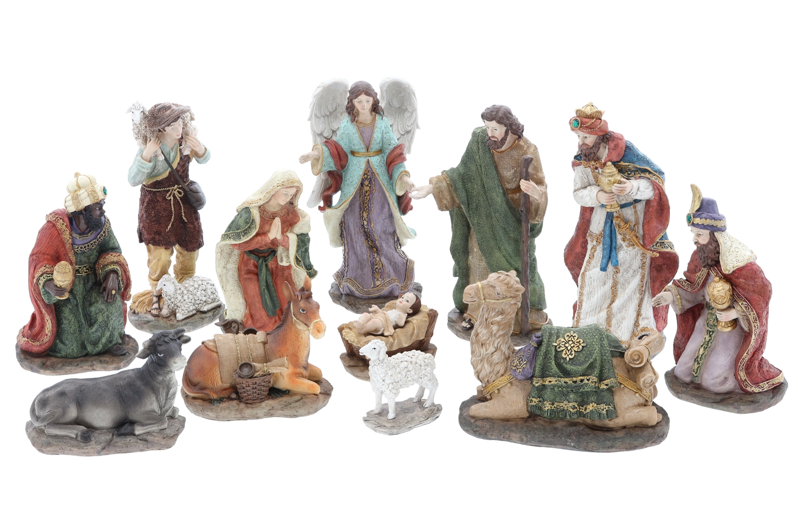 Súprava obsahuje Svätú rodinu, troch kráľov, anjela, pastiera aj zvieratá – všetko v zjednotenom štýle a farebnosti pre harmonickú vianočnú výzdobu.