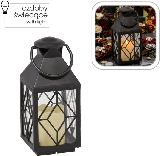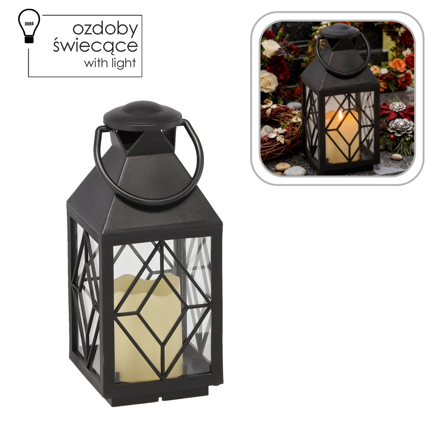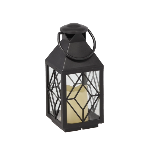 Čierny kovový lampáš so sklenenými panelmi a vzorom mriežky prináša pôsobivý svetelný efekt, ktorý zvýrazní každý interiér aj exteriér. Integrovaná LED sviečka poskytuje príjemné teplé svetlo bez plameňa, takže je ideálna do domácností s deťmi či domácimi miláčikmi.