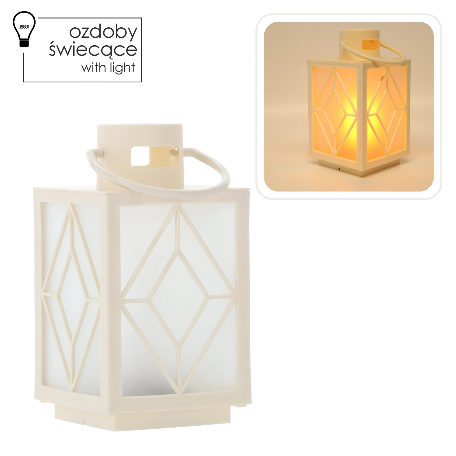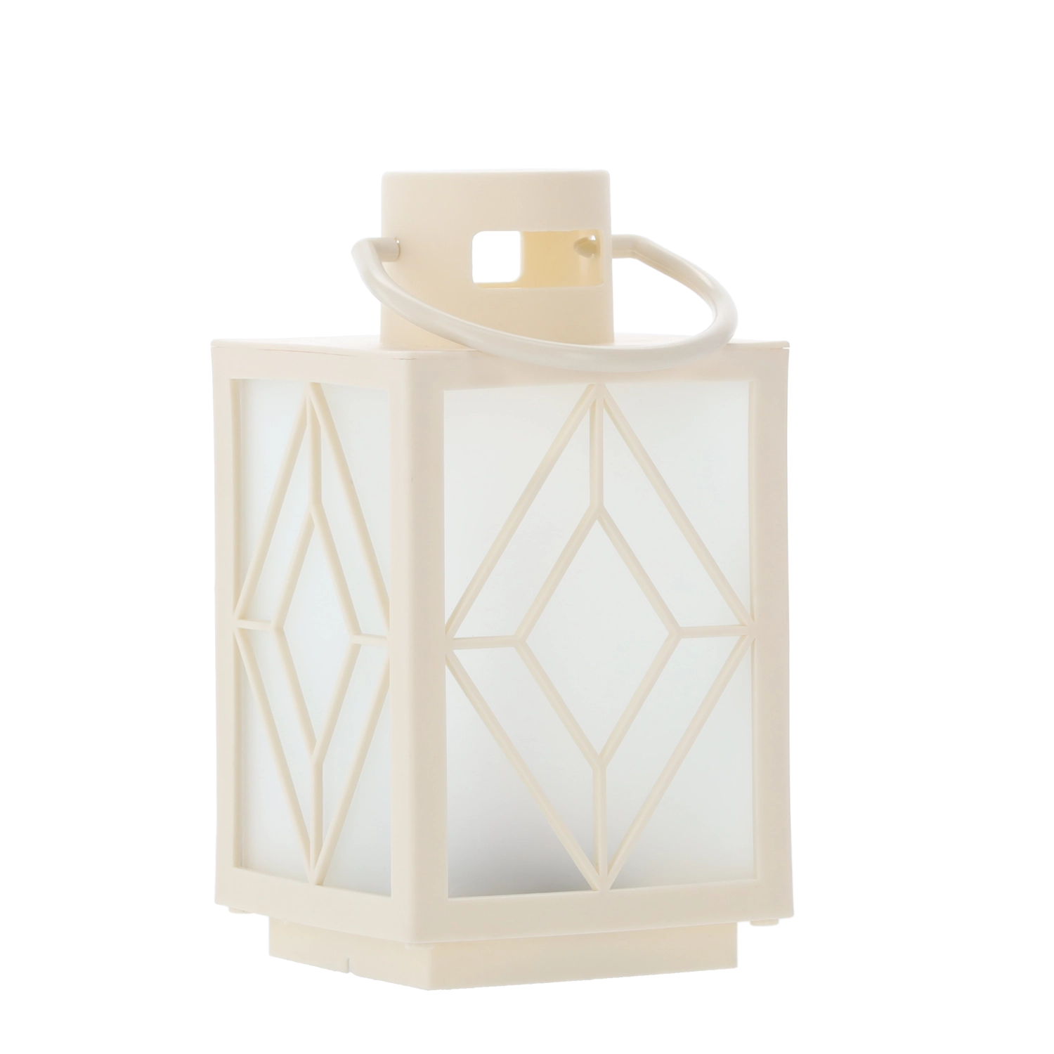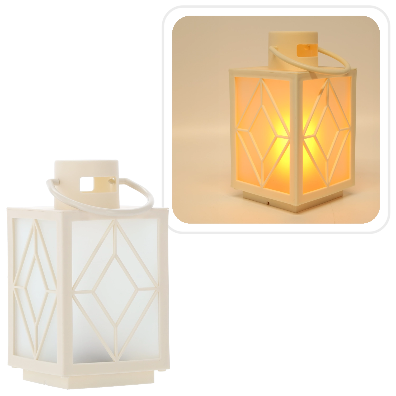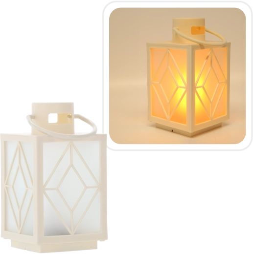 Ozdobte svoj domov jemným teplým svetlom. Biely dekoratívny lampáš s mrazenými výplňami a geometrickým motívom poskytuje príjemne rozptýlené osvetlenie pripomínajúce sviečku, ale bez dymu a vosku. Ideálny na adventnú výzdobu, večerný relax alebo slávnostné stolovanie.
