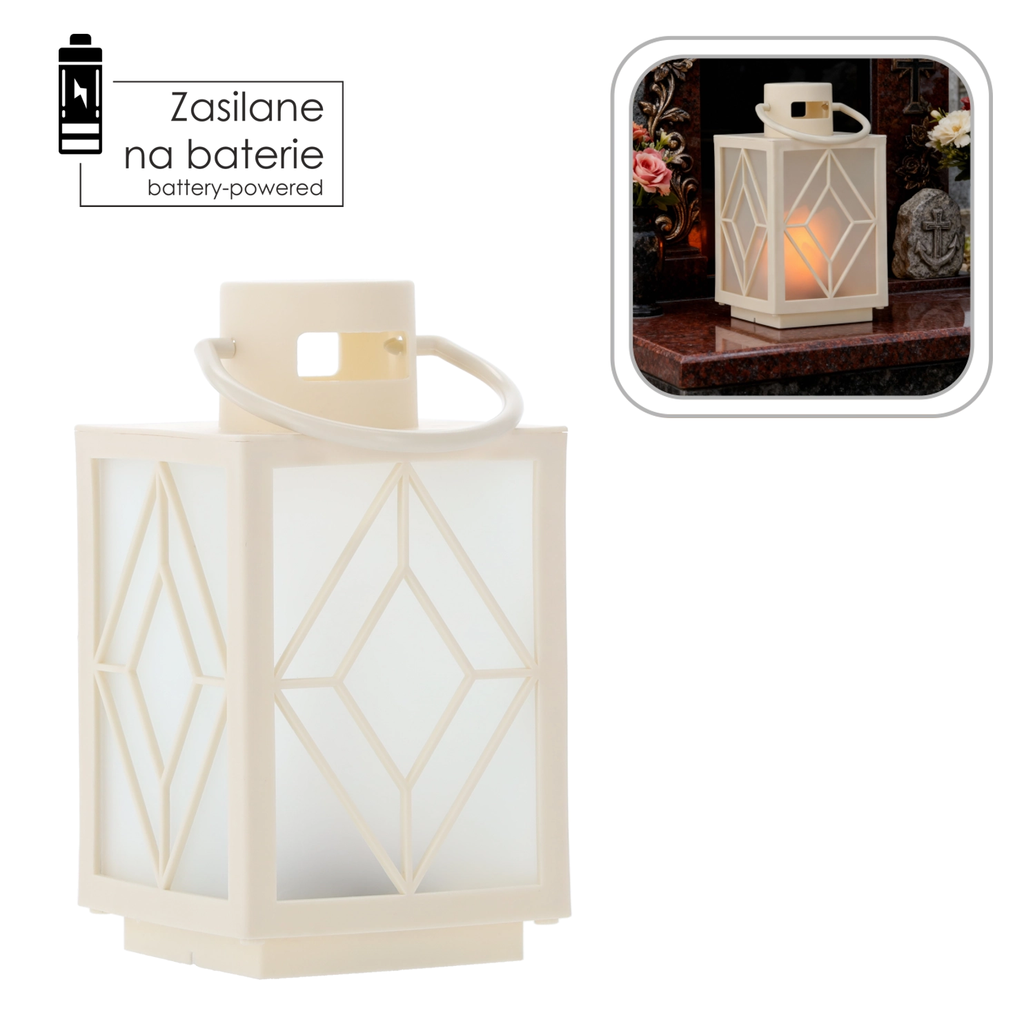 Vďaka napájaniu na batérie je lampáš plne prenosný – ľahko ho postavíte na poličku, terasu či cintorínny pomník. Pevné madlo umožňuje zavesenie a rýchlu zmenu umiestnenia podľa potreby.